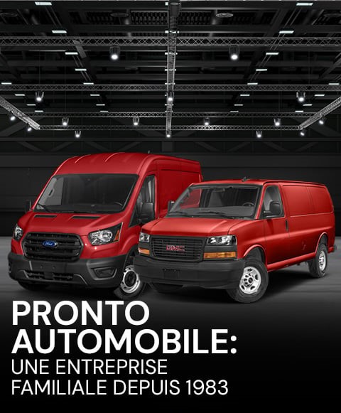 Fondée en 1983, Pronto Automobile est une entreprise familiale qui a su bâtir au fil des années sa réputation par la qualité exceptionnelle de ses véhicules Commerciaux d'occasion, ses prix inégalables et son service après-vente rapide et convivial. Nous comptons parmi nos clients des entrepreneurs à travers le Canada. Que ce soit pour un véhicule de travail unique, une série de véhicules ou bien pour le rajeunissent périodique de votre flotte de véhicule, Pronto Automobile détient l'inventaire et l'expertise pour mener à terme votre projet.