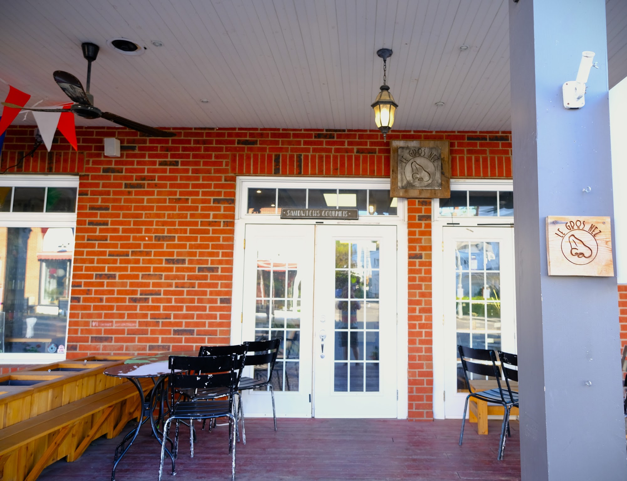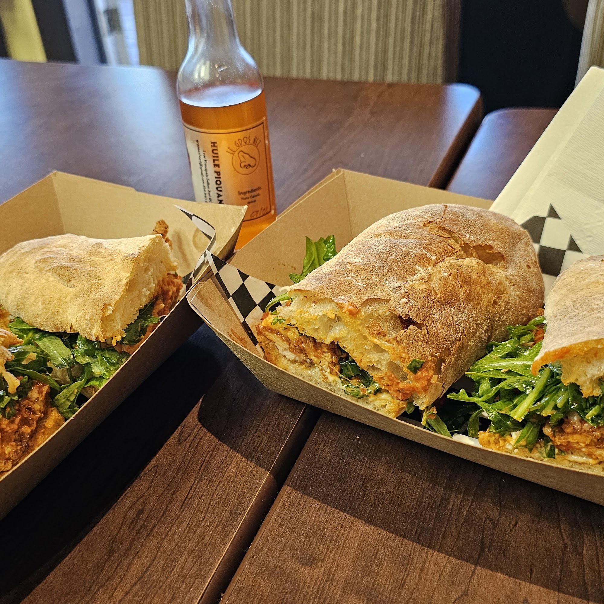 Le Gros Nez is a spot for a casual lunch, offering some of the best sandwiches reviewers can remember having. The menu includes fantastic options like a tuna melt, chicken parm, eggplant parmigiana, a mortadella with antipasto, and a crispy tofu and kimchi sandwich. The sandwiches are super generous in size, incredibly tasty, and feature amazing, great bread that makes them. The quality and price are great. The owner and server are noted for their friendliness and wit. It is worth the trip for a delicious meal, with the option to take away or eat on the deck just in front.