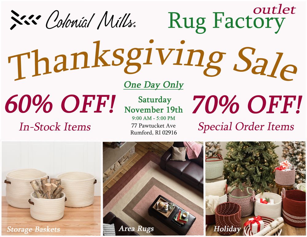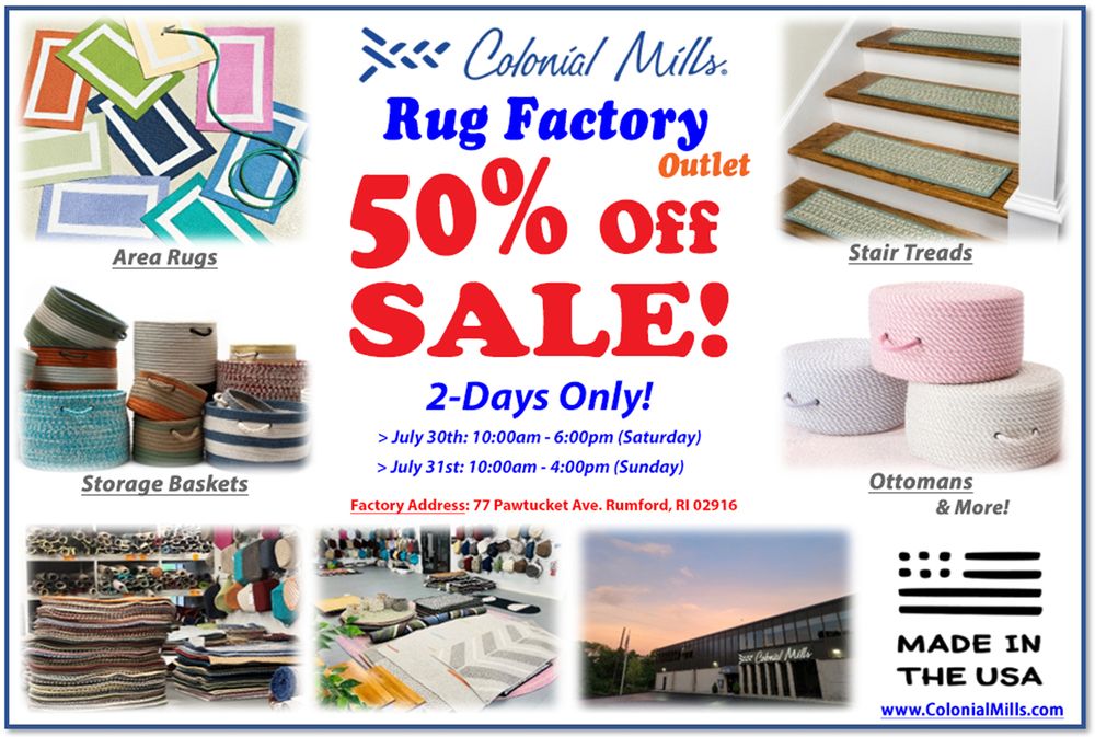 Warehouse outlet sales are Open quarterly and on holiday weekends. Follow colonial Mills on Facebook or sign up for their mailing list to know these dates. Great deals on area rugs , runners storage baskets and hampers ! ( Prices are cheaper during the outlet mill sale on location compared to the online prices listed )