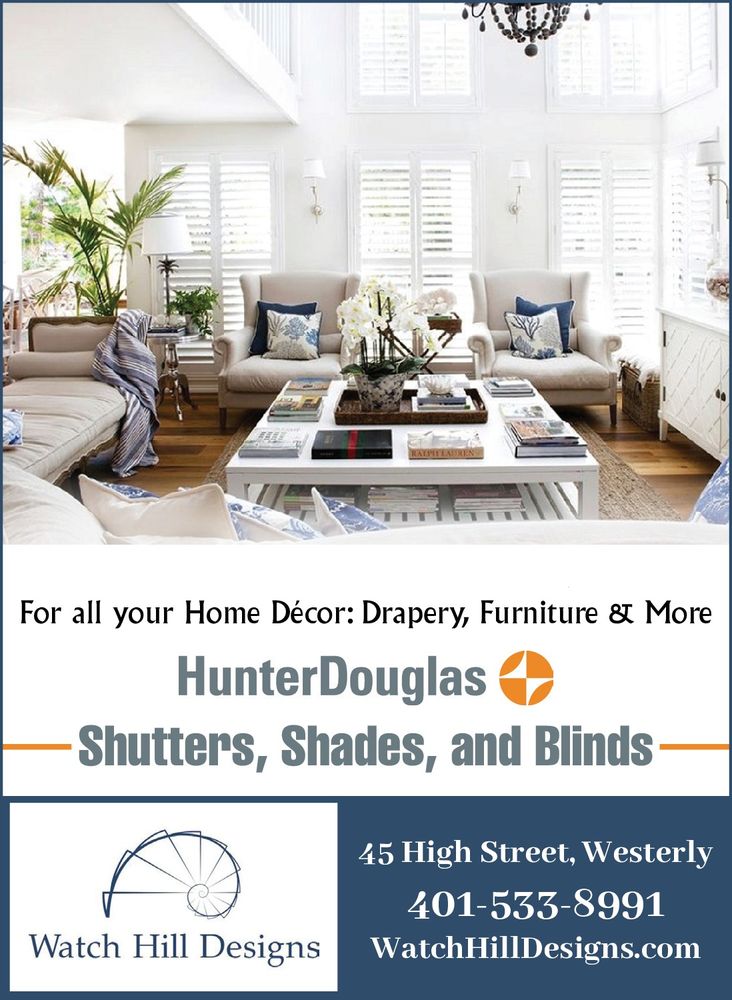 Watch Hill Designs is a full-service interior design firm located in Westerly, RI, specializing in collaborative design! Whether you just need Hunter Douglas blinds, shutters and shades or a full home makeover- we have everything at our fingertips and bring it directly to you. Watch Hill Designs transforms even the simplest area into a stunning space. An experienced Interior Designer, the owner has been working in the business since 1989. Started in East Greenwich RI, Sherry Pierce moved her family to Westerly and has developed a loyal and enthusiastic clientele. Get in touch to find out more about working with Watch hill Designs.