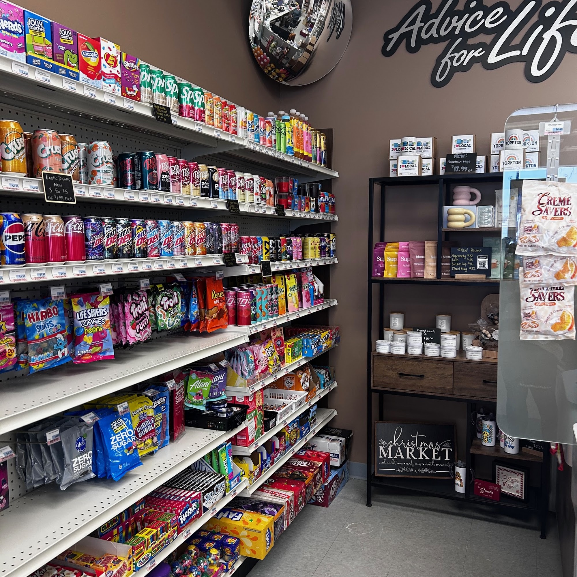 Friendly. Always something new and interesting on the shelves. Import candies, pop and other treats. Better gift items than the usual pharmacy findings. Even the plushies are more interesting. Worth a trip in to see for yourself.