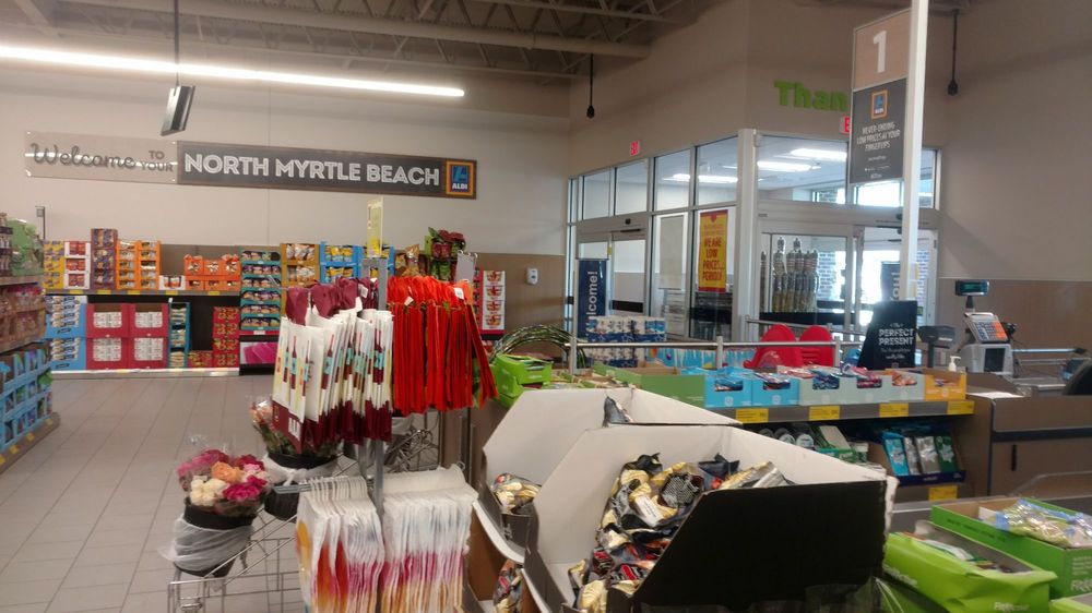ALDI in North Myrtle Beach offers low prices and great value on groceries and home goods. The store features fresh produce, meats, organic foods, beverages, and award-winning items. Customers praise the reasonable prices, good selection of vegetables, fruits, cheeses, and wine, along with seasonal finds. The store is generally clean and stocked regularly, though some note occasional out-of-stock items or disorganized shelves. Shoppers recommend bringing bags and a quarter for the cart. Services include online shopping with curbside pickup or delivery. It is a go-to store for quality basics and affordable favorites like inexpensive protein and water.