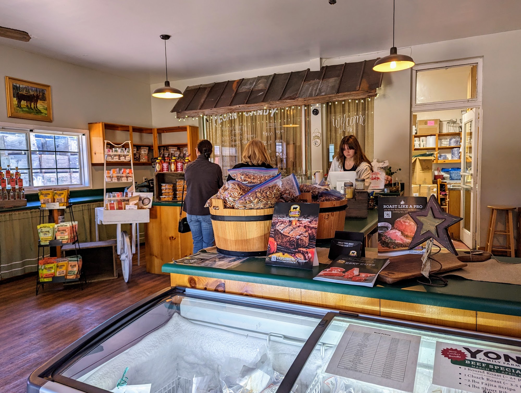 Friendly service, delicious local products. I love the gift tins of dark chocolate pecans, white chocolate pecans, pecan brittle, pecan pralines and roasted pecans. They also sell jelllies/jams, t-shirts, wax melts, and meat.