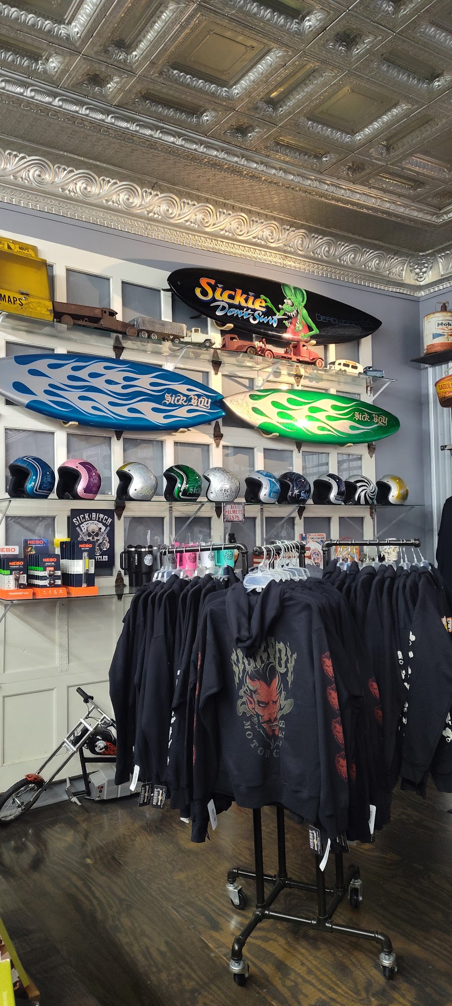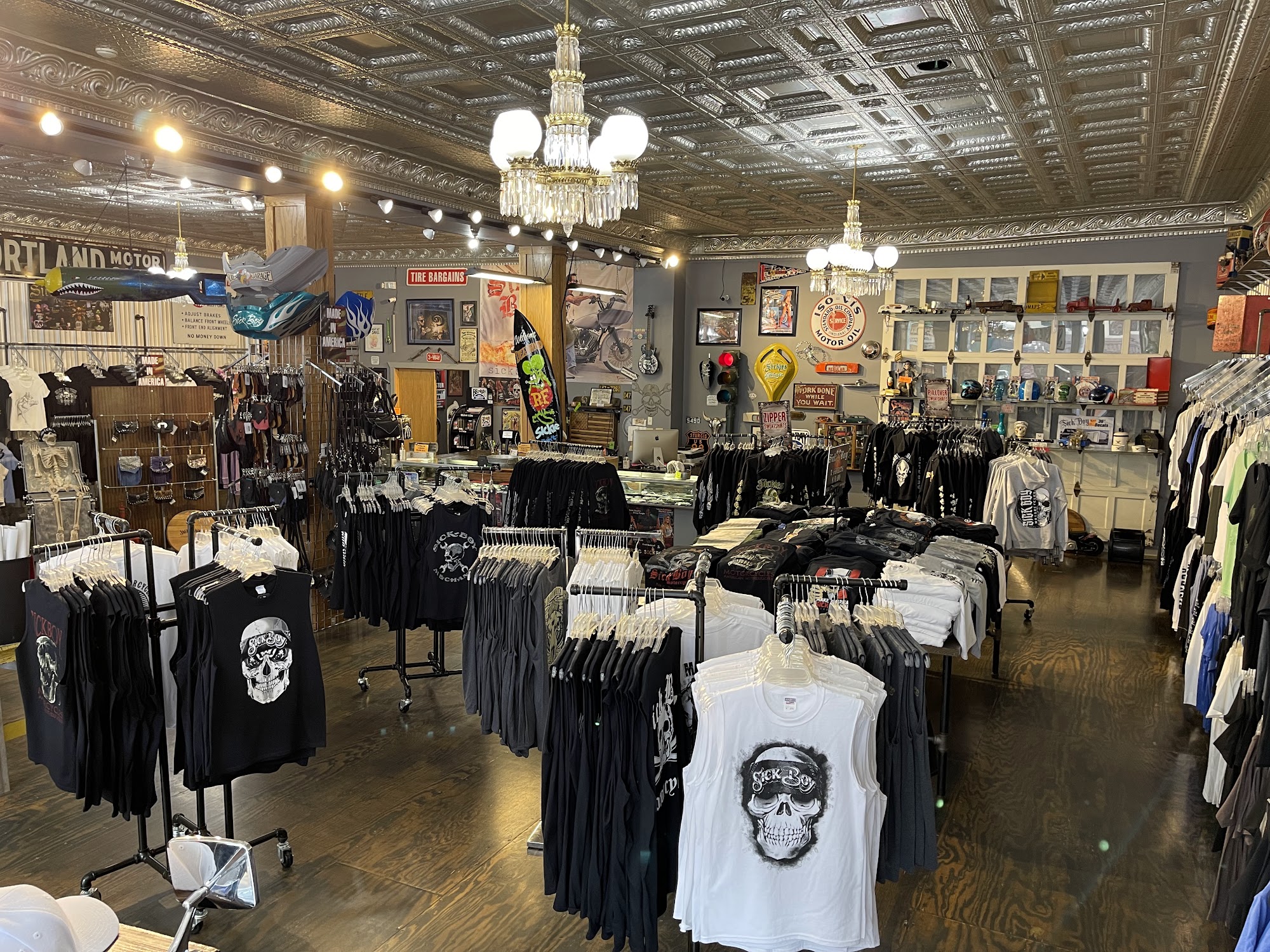 Sick Boy is a clothing brand that has been offering merchandise for car and motorcycle enthusiasts since 1999. The store is packed with a unique selection, including antique wall hangings, custom-painted helmets, and other odd items. Customers praise the excellent customer service, with the friendly staff and their "shop animals" creating an inviting atmosphere. The store's wide range of products, from summer tank tops to winter jackets, caters to the diverse needs of its car and motorcycle-loving clientele. Whether you're looking for a shirt to express your "sick boy" status or a rusted-out, hand-painted car door for your man-cave, Sick Boy has something to offer. With its welcoming environment and impressive inventory, Sick Boy has become a favorite destination for enthusiasts in the local community and beyond.