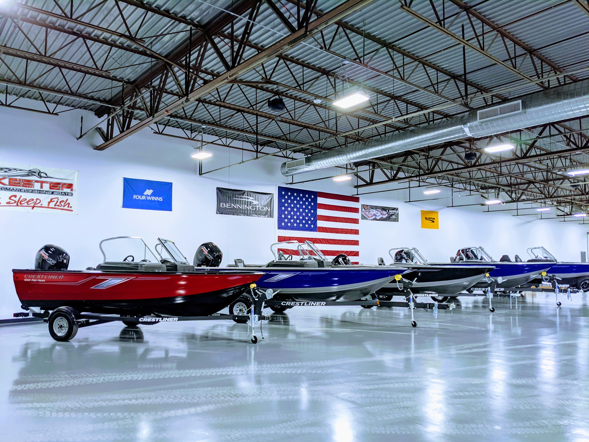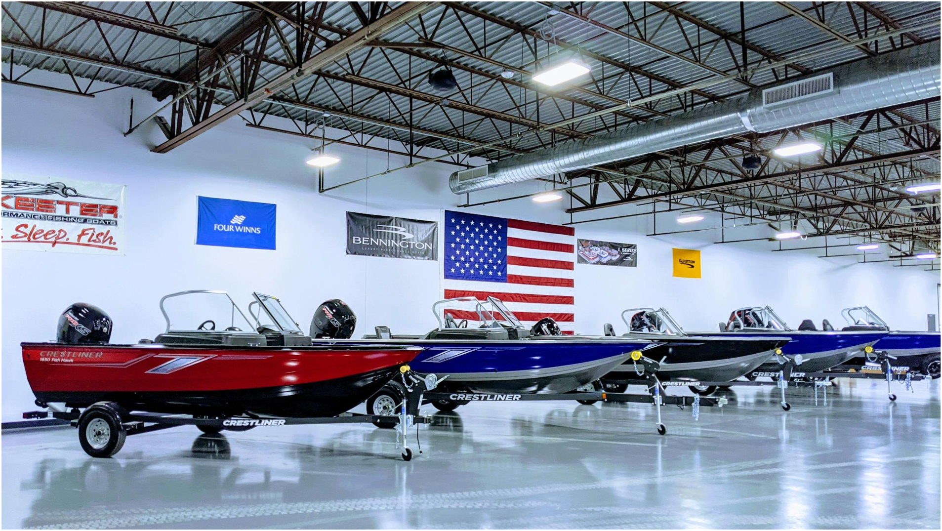 Huge showroom with a great selection of pontoons and boats.