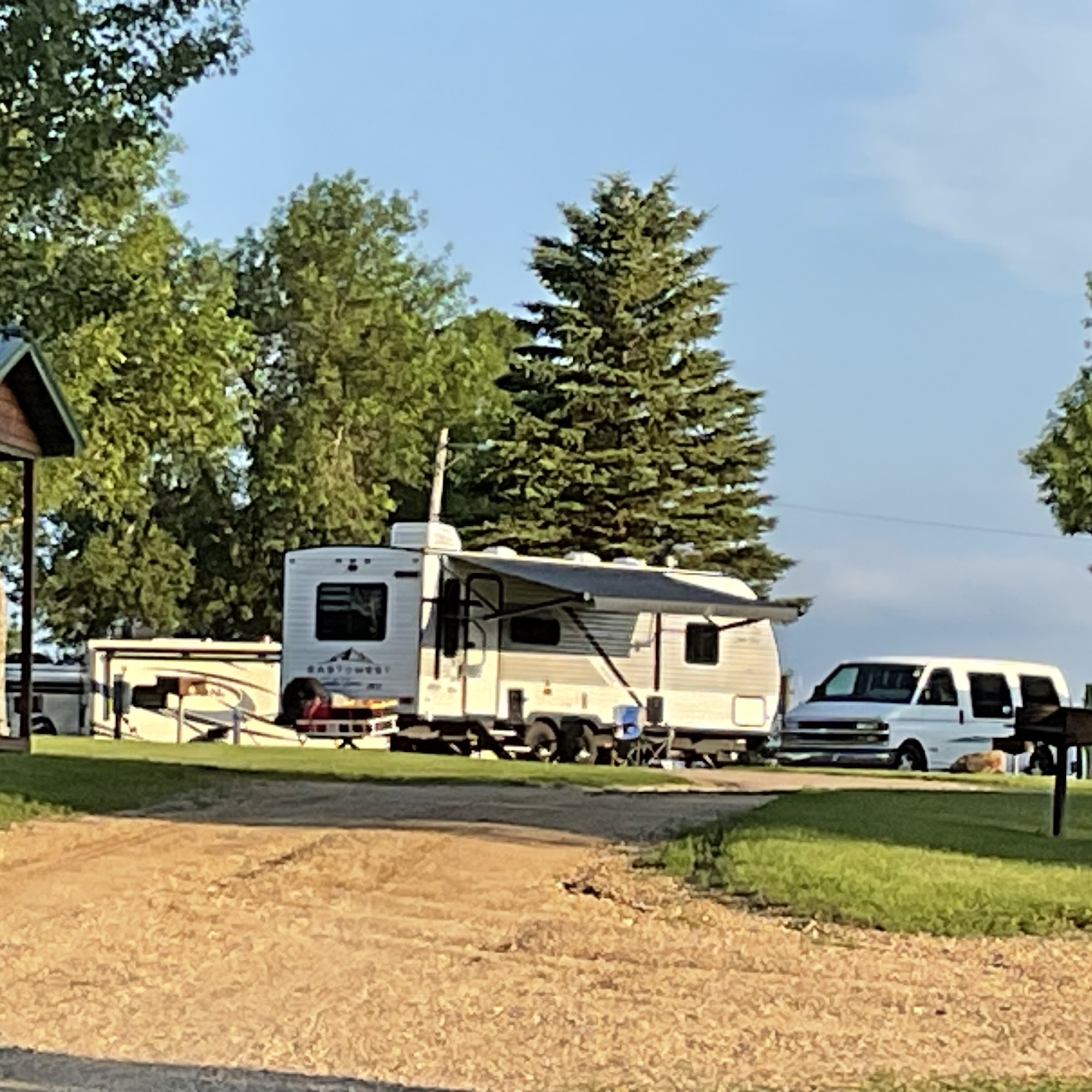 County Line Campground in Summit, South Dakota, is a well-maintained and friendly camping spot that offers a quiet and convenient place to stay. The campground has grown from 25 to 75 sites over nine years, accommodating more foot traffic and events during the summer. It is open year-round, making it a rare find in the area. Visitors note that the sites are level, tidy, and equipped with full hookups, picnic tables, and grills. The large, clean bathrooms and laundry facilities are highly appreciated, and the staff, including owners Larry and Gilda, are friendly, helpful, and welcoming. The campground features a small store selling snacks, firewood, and propane, and offers rentals for small cabins and campers. It is pet-friendly, with a reminder for owners to keep pets on a lease and clean up behind them. The location is close to I-29, making it easily accessible, and the area is peaceful, with only occasional trains and trucks that do not disturb the quiet. During the summer, the site becomes lively with foot traffic, events, and weekly jam sessions, where visitors can enjoy ice cream and music under a large covered patio. The campground is highly praised for its cleanliness, friendly atmosphere, and the sense of community it fosters, making it a great place for travelers and groups to relax and enjoy their stay.