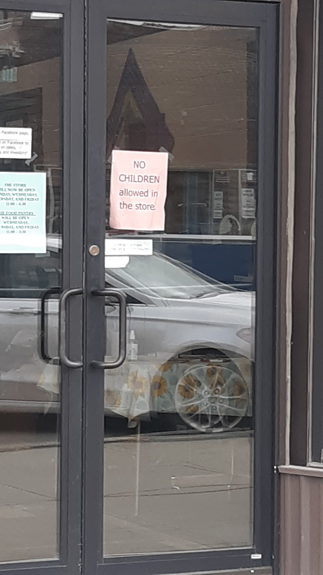 A few years ago there was a sign on the door that stated not even service dogs allowed. Today a sign stated no children allowed. Not that they needed to be supervised (understandable) just ... not allowed. Into a thrift store that sells clothes and toys for children ?
