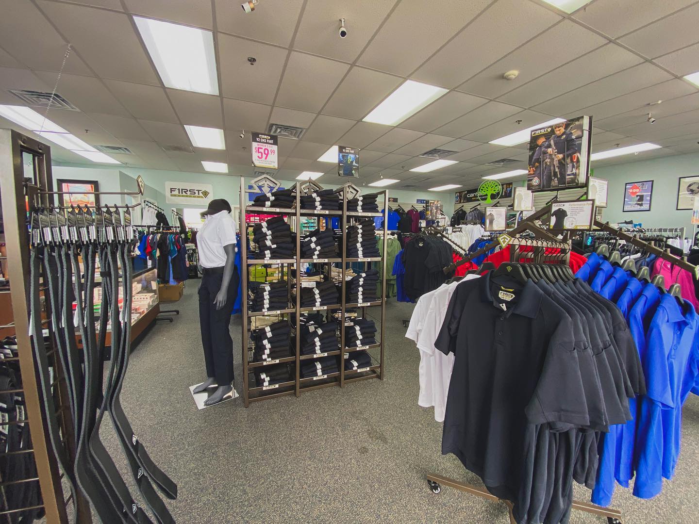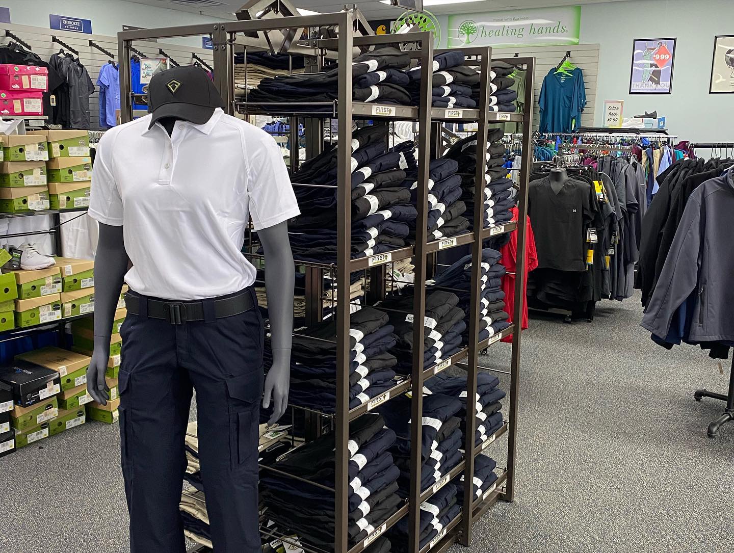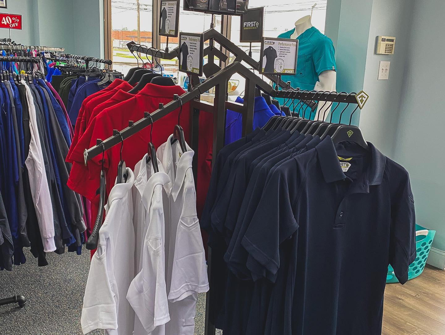 Plaza Uniforms is a deceivingly large store with a super large selection on the rack, including a huge section for men and seasonal scrubs. The staff is always very friendly, extremely helpful, and sweet, offering help with finding items and recommendations. They provide assistance with sizes and brands and can special order things. There is plenty of shared parking in the lot with easy access on and off the road.