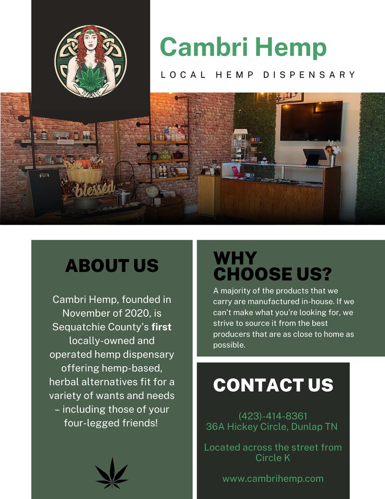 Cambri Hemp is a retail location serving 60+ miles of the beautiful Sequatchie Valley. We specialize in hemp-derived cannabis products, because we believe that a lot of potential lies in this plant. One of our goals is to provide you with the best products available in a quality over quantity approach, formulating our products in small batches to ensure you leave our store with a product you can count on. We've stocked our shelves with a variety of cannabinoids to fit a variety of people (and pets too!). So stop in today and speak with an associate to find the right one for you!
