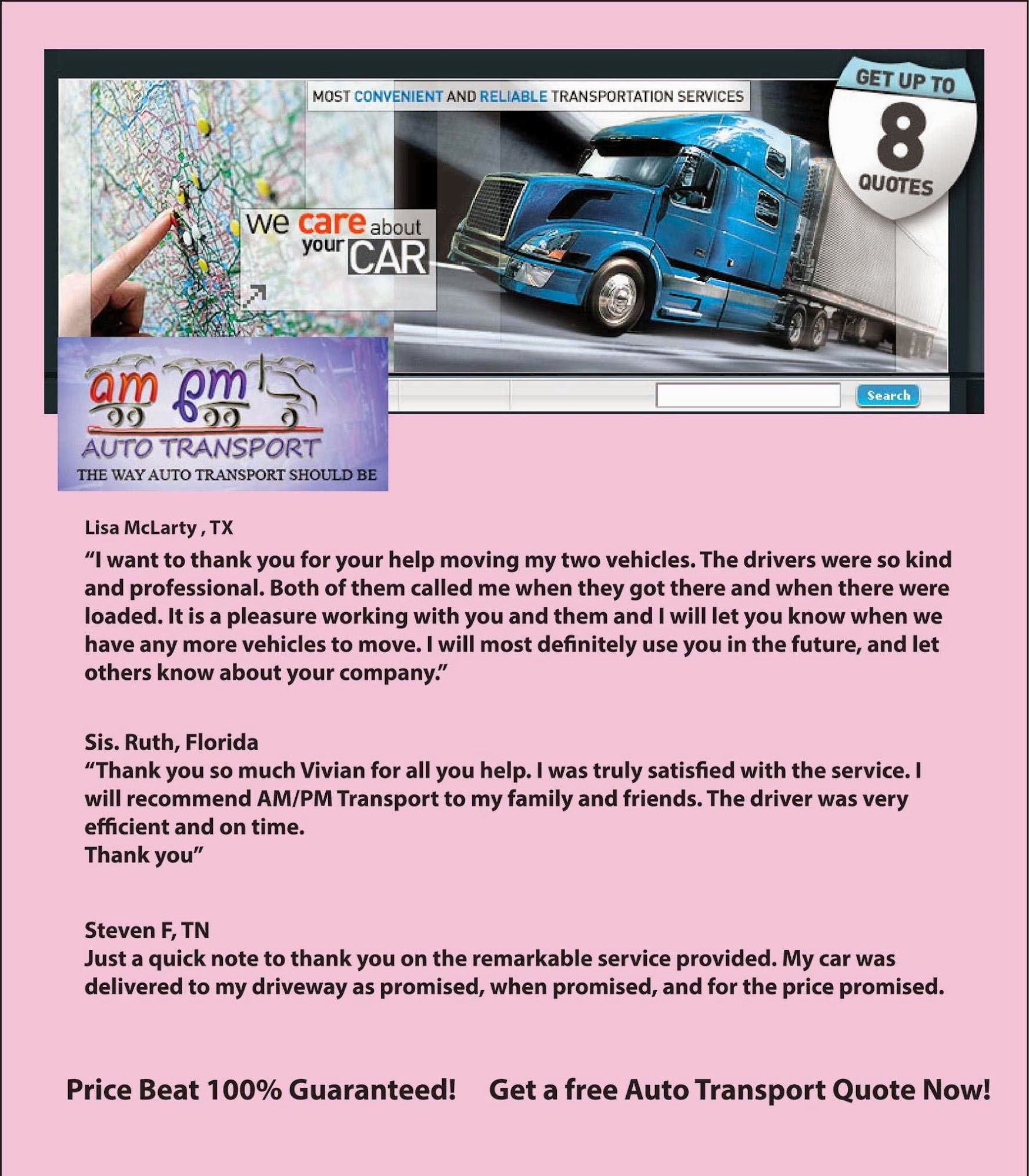 AMPM Auto Transport | Tennessee is a trustworthy auto shipping company with over 12 years of experience. They offer a flexible fleet that can ship vehicles nationwide, including Alaska and Hawaii. Customers can choose from various auto transport types such as open and enclosed car transport, door-to-door, and expedited services, ensuring options that suit different needs. The company provides full insurance coverage for vehicles during transport, giving peace of mind. Live agents are available to assist and answer questions, offering helpful recommendations throughout the process. Customers highlight their on-time delivery, professional service, and careful handling of vehicles, with cars arriving in good condition and without delays. Overall, AMPM Auto Transport is known for reliable, customer-focused auto shipping services across Tennessee and beyond.