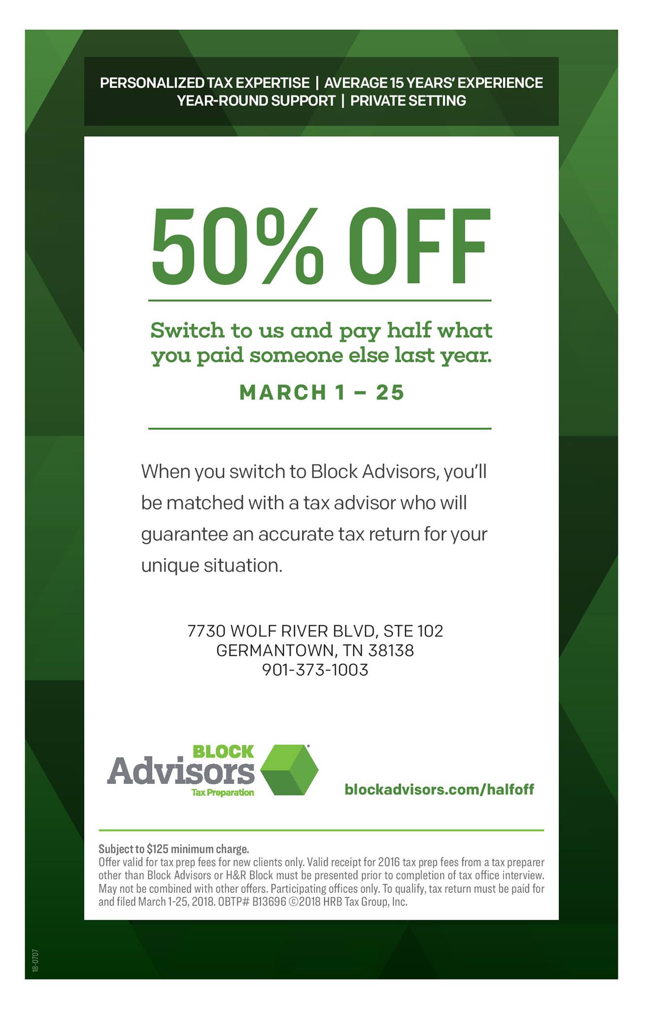 Specialties: Experienced Tax Advisors averaging 15 years of experience, 100% Accuracy Guarantee, Over 40% of Tax Advisors hold top 2 certifications offered by Block Advisors, Year-Round Tax Preparation and Planning, Highly trained Tax Advisors who are required to pass specialty tax training each year, Business Services: Bookkeeping, Payroll, Max Refund Guarantee