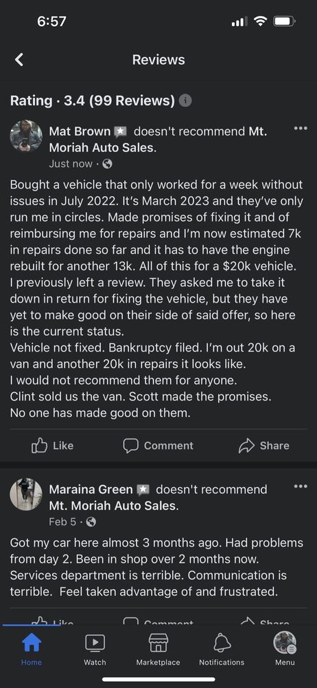 Mt. Moriah Auto Sales is a longstanding used car dealership that has been in business for over 20 years. With a vast inventory of over 300 vehicles, the dealership has sold over 50,000 cars and trucks of all sizes. Customers can choose from various financing options, including finance, cash, and wholesale, with an easy buying process. The dealership's service department is equipped with 28 bays to thoroughly inspect each vehicle before it's made available for purchase. They provide dealership-quality repairs at fair prices for all makes and models, whether the customer purchased the vehicle from them or not. Customers have consistently praised the friendly and professional staff at Mt. Moriah Auto Sales, highlighting their patience and willingness to work with customers, even those with less-than-perfect credit. The overall experience has been described as pleasant, positive, and the easiest car-buying process customers have ever had. Special mentions go to staff members like Greg Harris, Henry Simmerman, Rebecca, and Rod, who have gone above and beyond to ensure a smooth and satisfactory purchase.