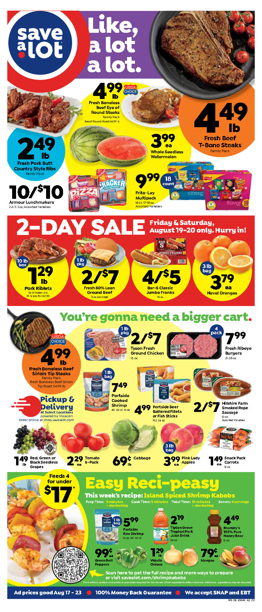 Save A Lot is a discount grocery store that offers low prices on fresh produce, quality meats, and carefully selected grocery items. The store provides weekly deals, making it possible for customers to plan family meals on a budget without compromising quality. Customers have praised the store's amazing prices, friendly staff, and well-stocked shelves. One customer was able to find everything on their list, except for a couple of items, and the total cost was half the price of their usual grocery haul at a competitor. Customers have also highlighted the store's convenient location, improved product selection, and cleanliness. Overall, Save A Lot is a popular choice for budget-conscious shoppers who value quality and customer service.