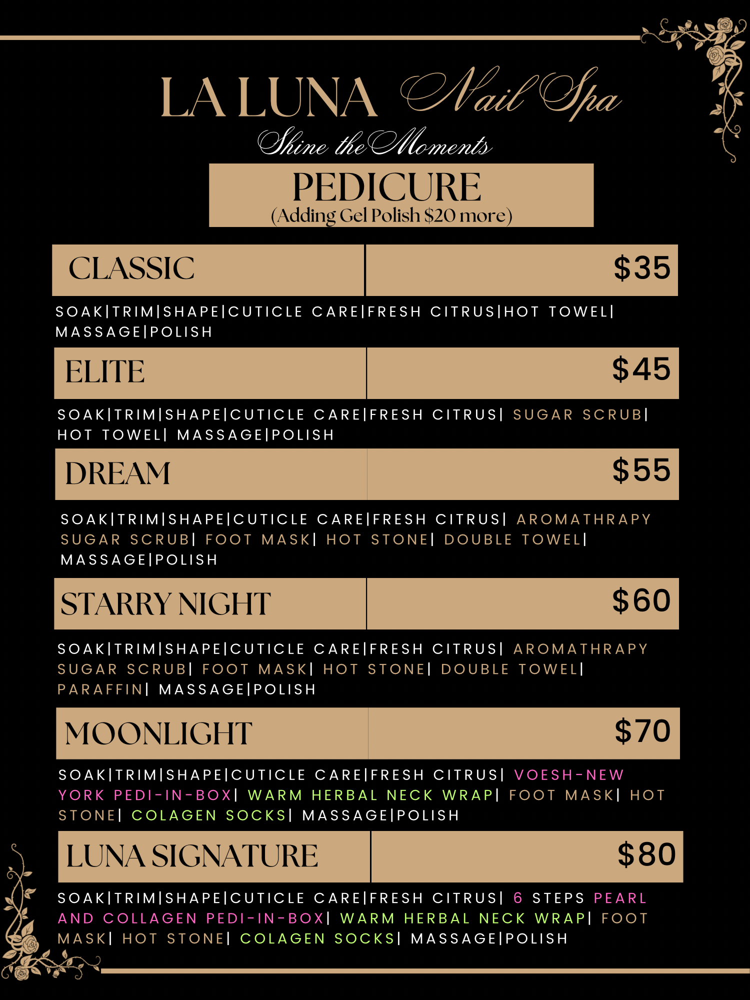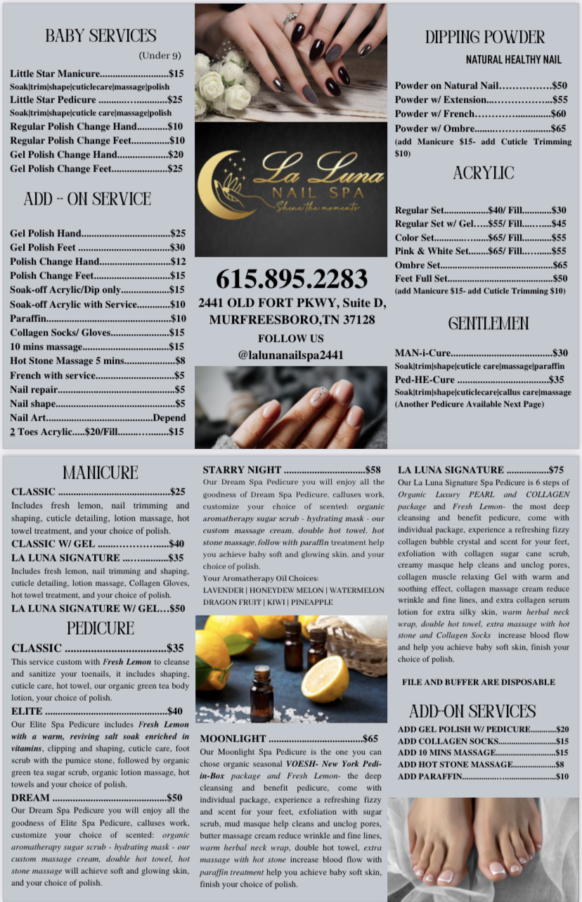 I have been going to La Luna nail on and off since they opened. They always remember my name no matter how long it has been since my last visit. Nail techs are very kind and explain the process to you each step of the way. Always a pleasure at this salon.