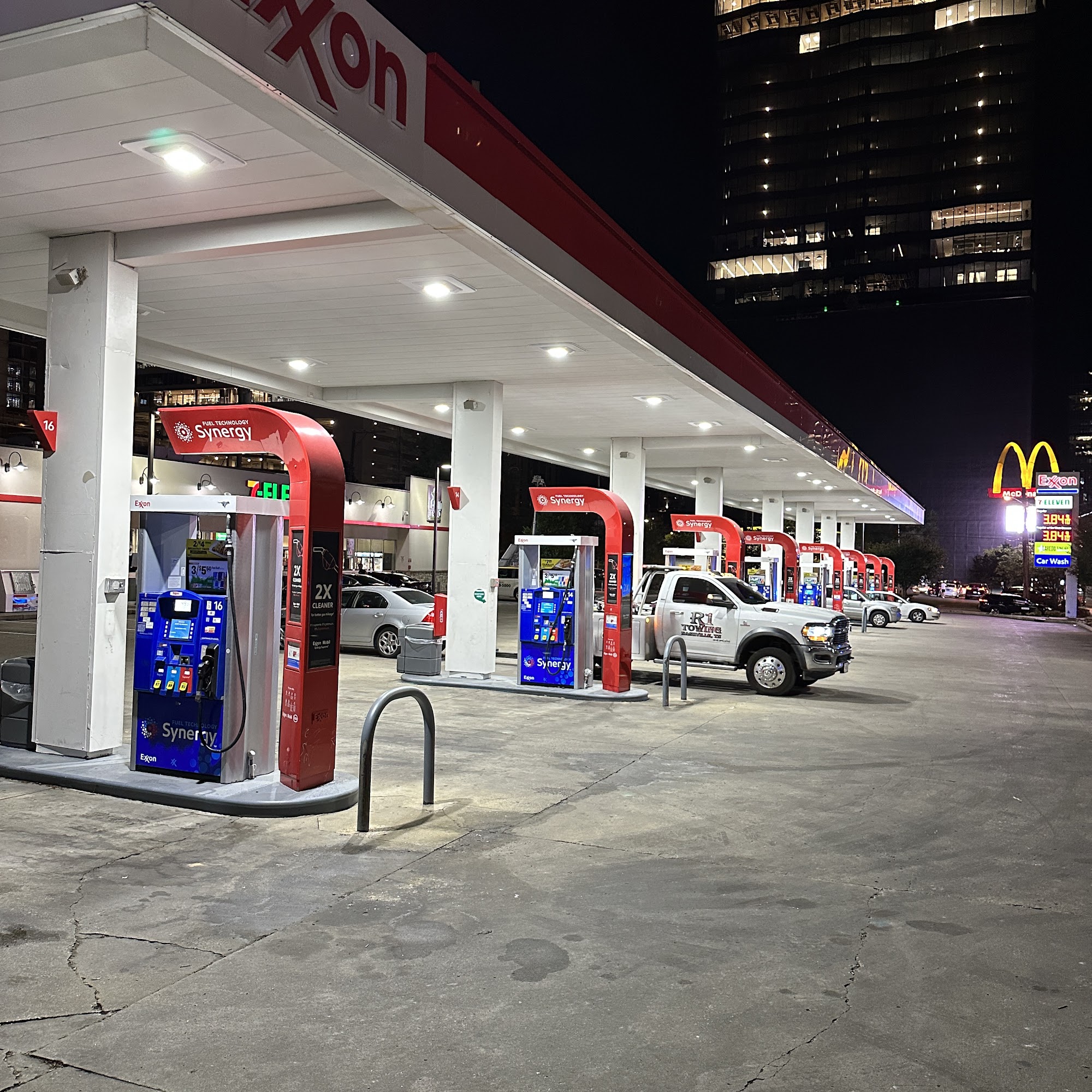 Exxon is a great gas station in downtown Nashville, where there are not many options. The guys there do good work and are helpful with requests like parking. It has a 7/11 inside with great services and snacks, including a little taco place with very good and cheap food. Some note that the receipt paper at the pump is often empty, requiring a trip inside. Homeless folks sometimes gather there. It was once a cool place to hang out and see people, though that has changed for some.