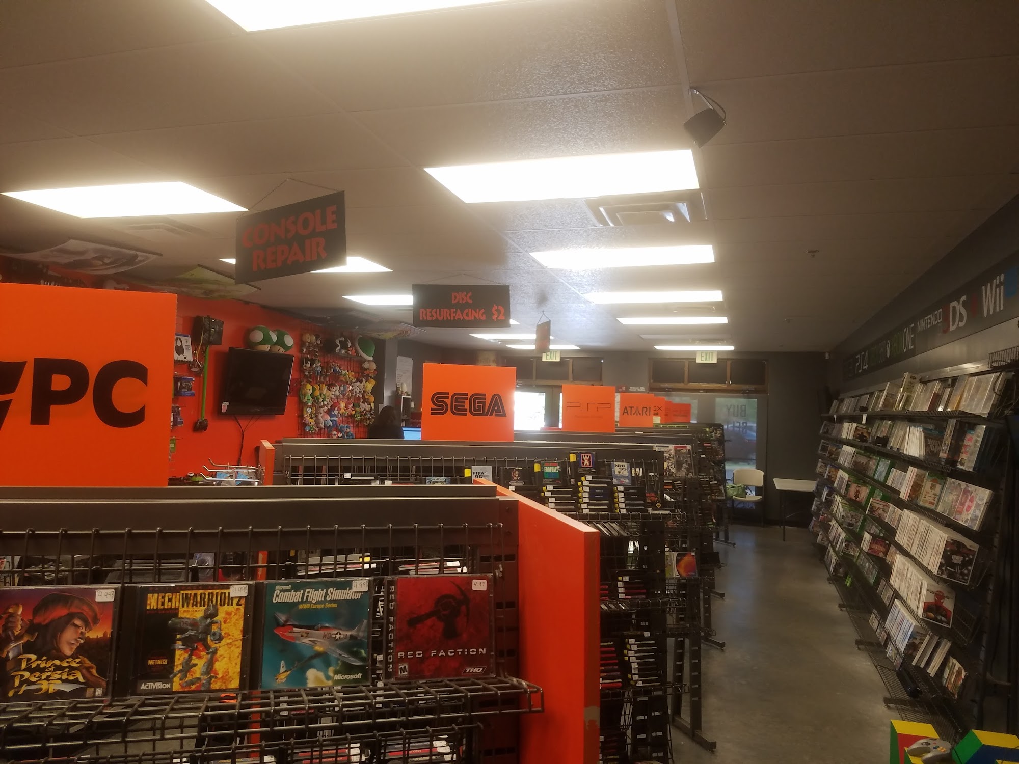Lots of games. Lots of consoles and controllers for sale. They also do repair work.