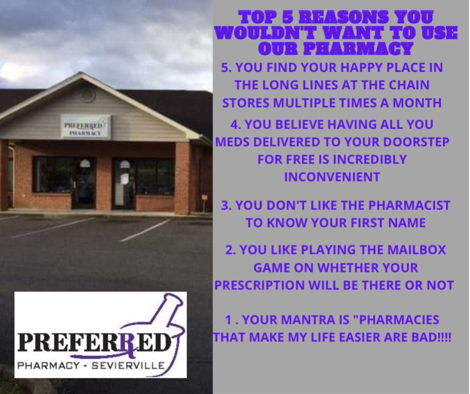 Preferred Pharmacy Sevierville is a friendly and helpful local pharmacy that consistently provides excellent customer service. Customers appreciate the staff’s politeness and kindness, noting that they treat everyone like friends and go out of their way to assist. The pharmacy offers quick drive-thru service, even during busy times, and staff members are patient, professional, and compassionate when answering questions or explaining options. They are willing to accommodate last-minute needs, such as waiting for late arrivals or filling prescriptions after hours. Many reviews highlight the staff's willingness to help with prescription transfers, including complex or controlled medications, without hassle or drama. The pharmacy is also praised for its affordability, often matching or beating prices of larger chains. Customers value the personal touch and the sense of community they feel when visiting, which sets this pharmacy apart from big-box stores. Overall, Preferred Pharmacy Sevierville is considered a trusted, hometown business that provides reliable, friendly, and efficient service, making it a preferred choice for many in the area.