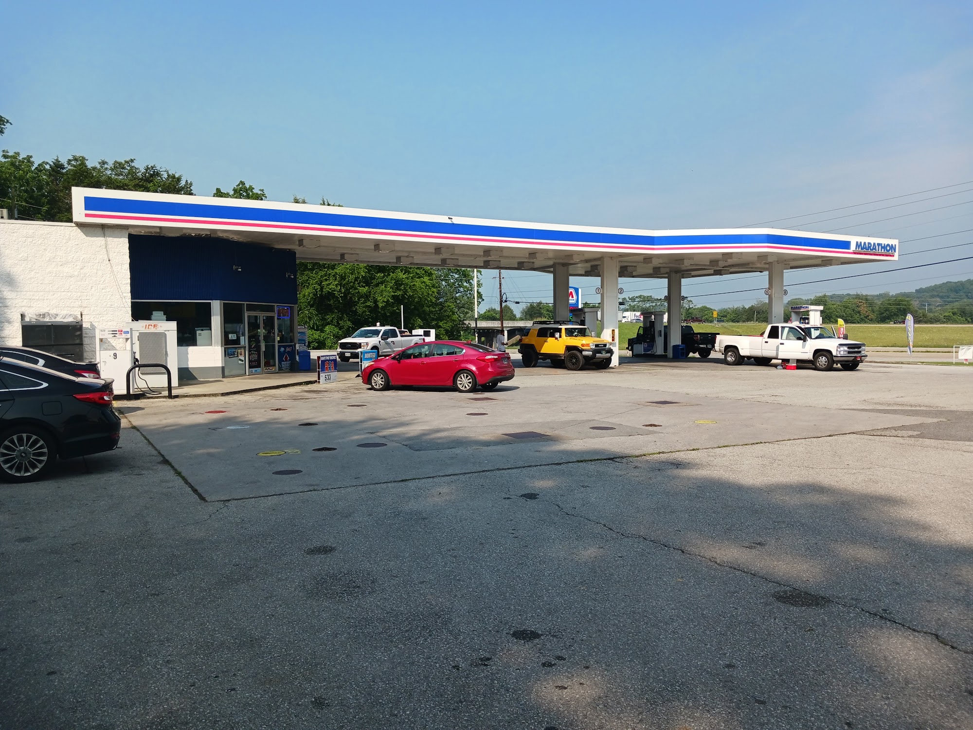 Marathon is a gas station and convenience stop. Reviews note it is not the cleanest place, with lots of junk food and items. However, it is also described as a clean little spot and a great stop for cooked food like Hunt Bros. Pizza. The employees are very nice, on the job, and quite cool. Truckers must use an app for parking or risk a fee. It is a great place for a 30-minute break, though bathrooms may not be available.