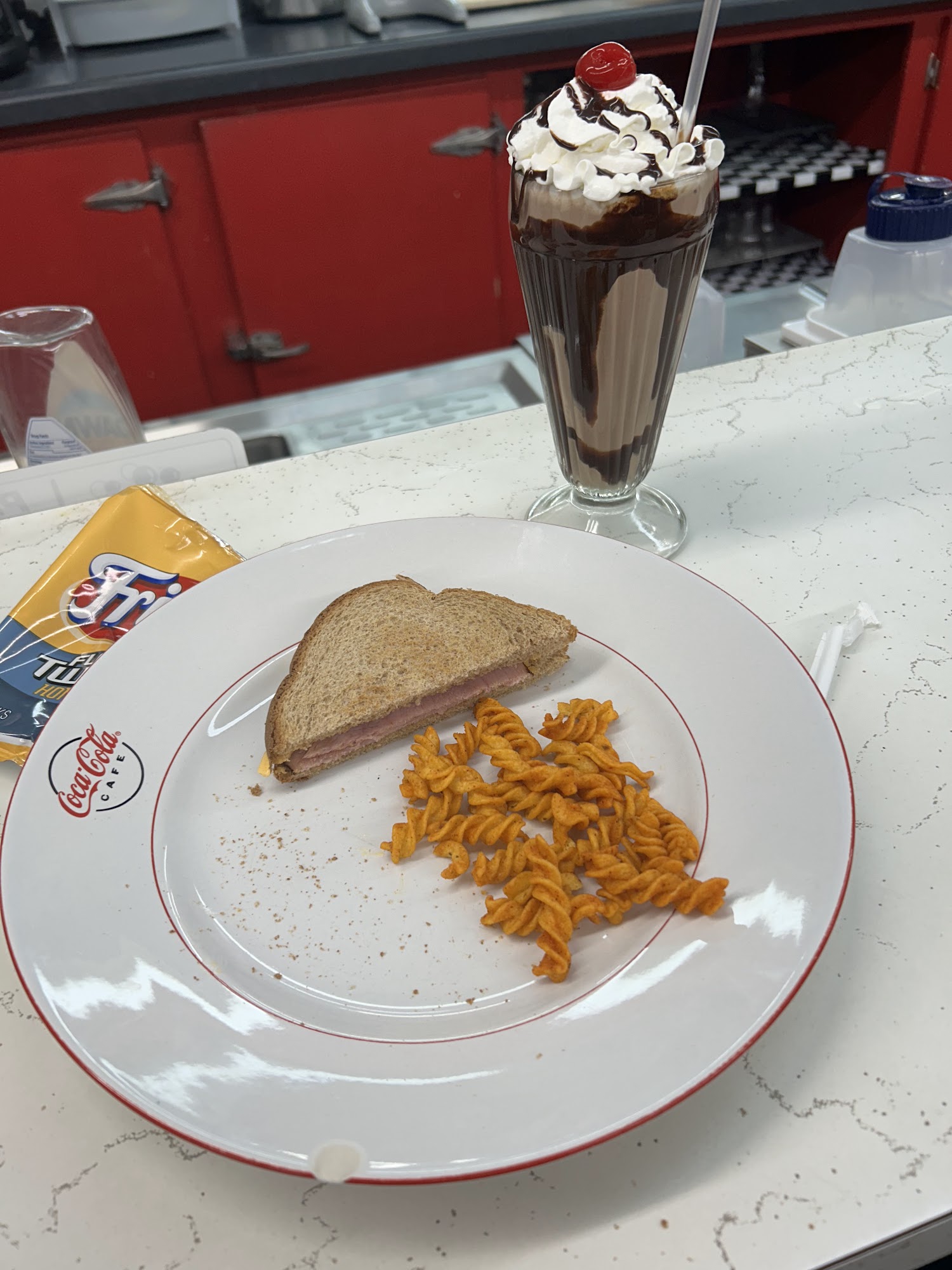 The chicken salad is excellent. The ice cream sundaes are great and huge.