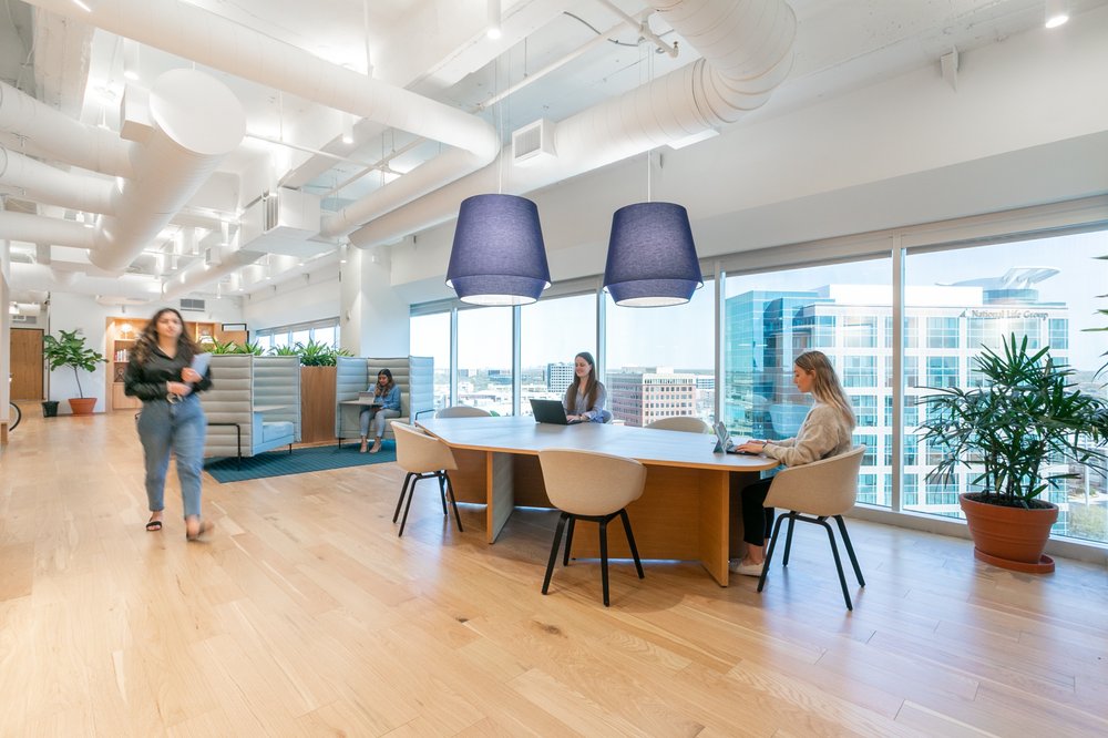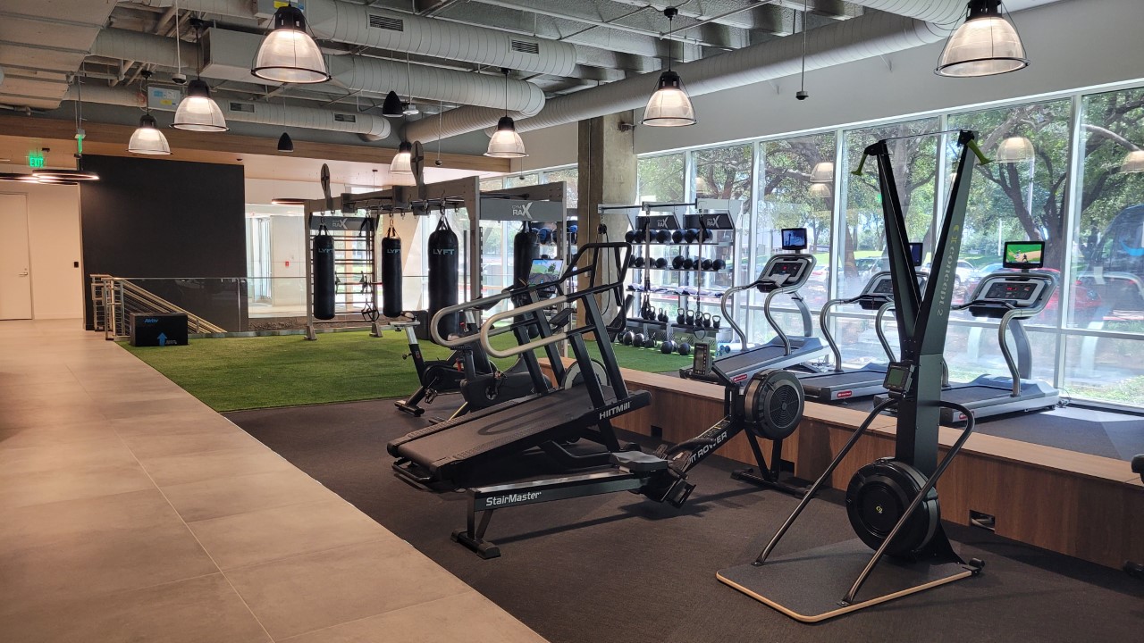 Atmosphere is relaxed, but condusive to collaboration. The outside is brought in for a home feel. The view of the airport is great! Downstairs gym is 2 floors of brand new exceptional quality workout equipment.