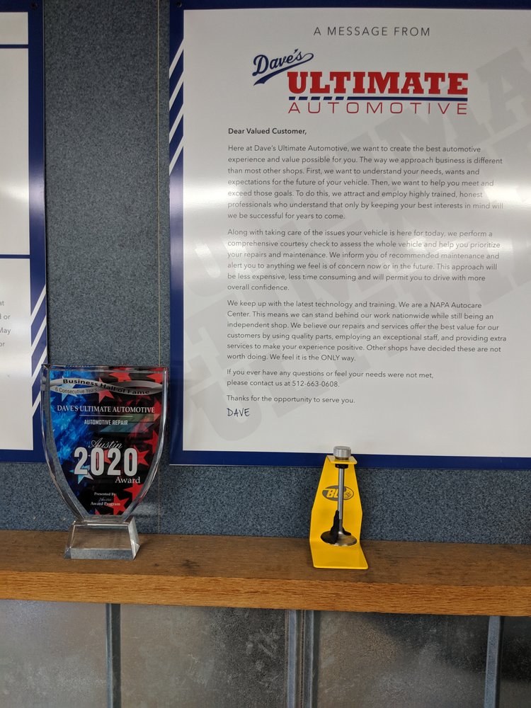 Dave's Ultimate Automotive is a trusted auto repair shop in the Austin area. Customers consistently describe it as a great shop with honest staff, good people, and smart, experienced technicians who do good work. Reviews highlight that they go above and beyond, providing seamless service and working well with insurance. Many report excellent experiences, noting the shop is clean and organized. A key strength is their honest approach to repairs, clearly explaining what is needed immediately and what can wait, and taking time to properly diagnose problems rather than recommending unnecessary, expensive work. They stand behind their work with warranties and offer helpful extras like rides to customers. The team earns strong recommendations, with many customers stating they won't trust anyone else with their vehicle and have found a customer for life.