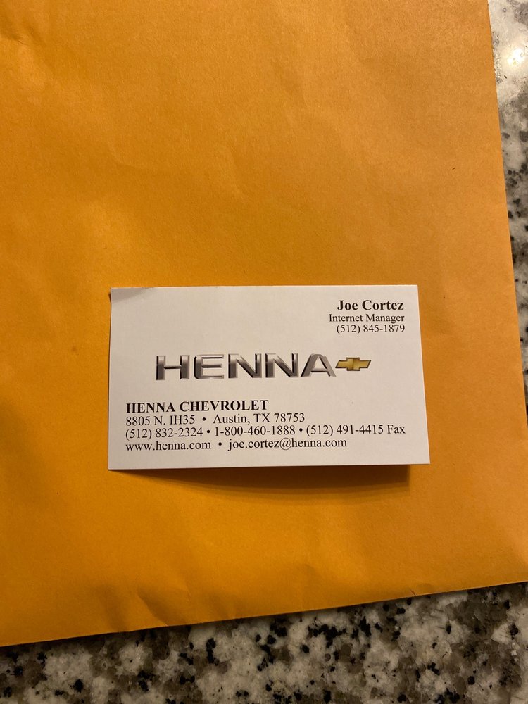 Henna Chevrolet, L.P. has been proudly serving the Austin, TX area for more than 7 decades. This new and used Chevrolet dealer treats every customer like family, catering to all of their automotive needs with exceptional customer service. Customers praise the dealership's helpful and knowledgeable salespeople, such as Mr. Jose Santamaria and Raul G., who ensure a smooth and satisfactory purchasing experience. The service department also receives positive reviews, with customers highlighting the courtesy and honesty of service consultant John Reyes Jr. Henna Chevrolet is described as a professional and reliable dealership, where customers feel they have found a solid car buying experience.