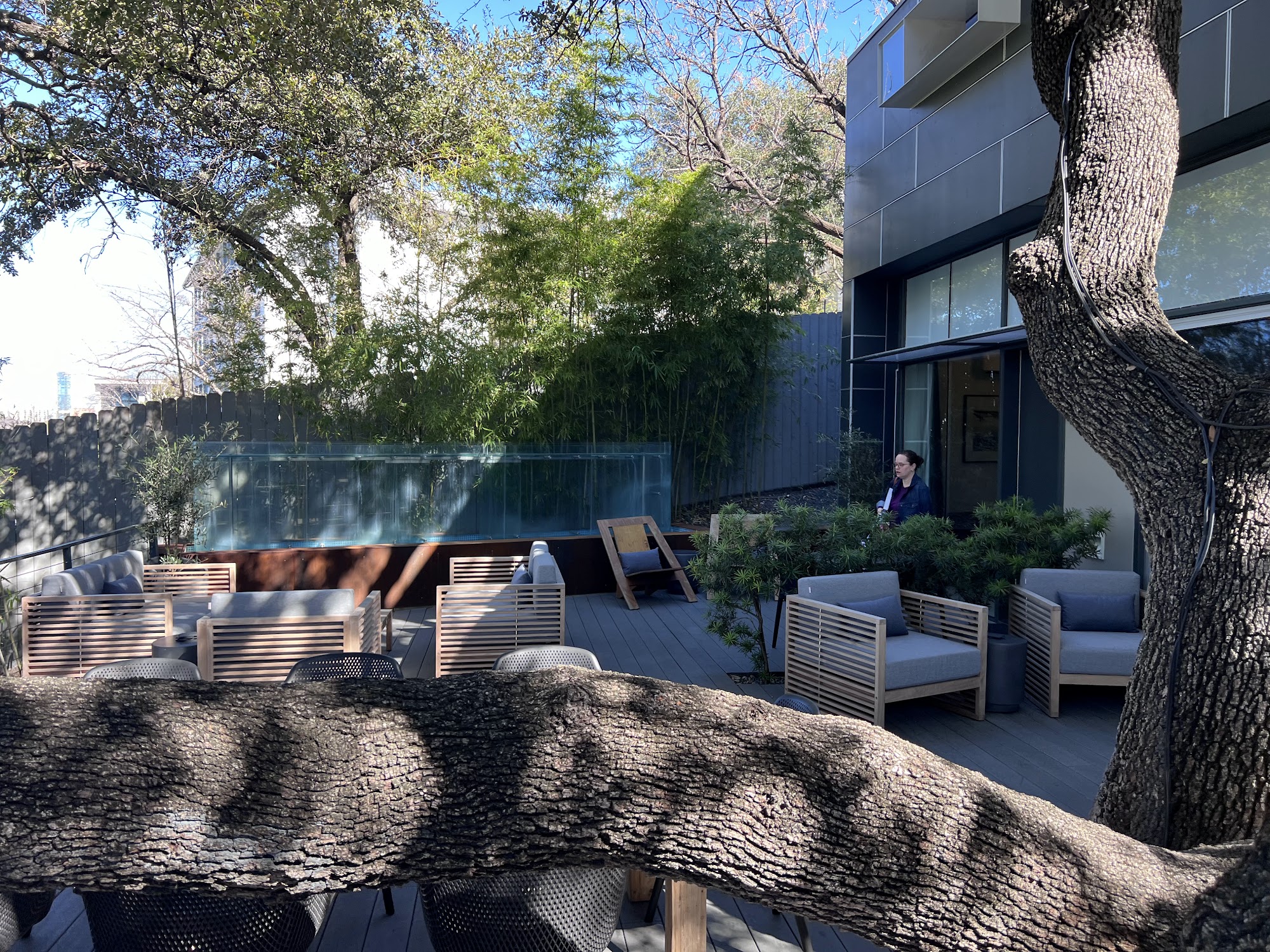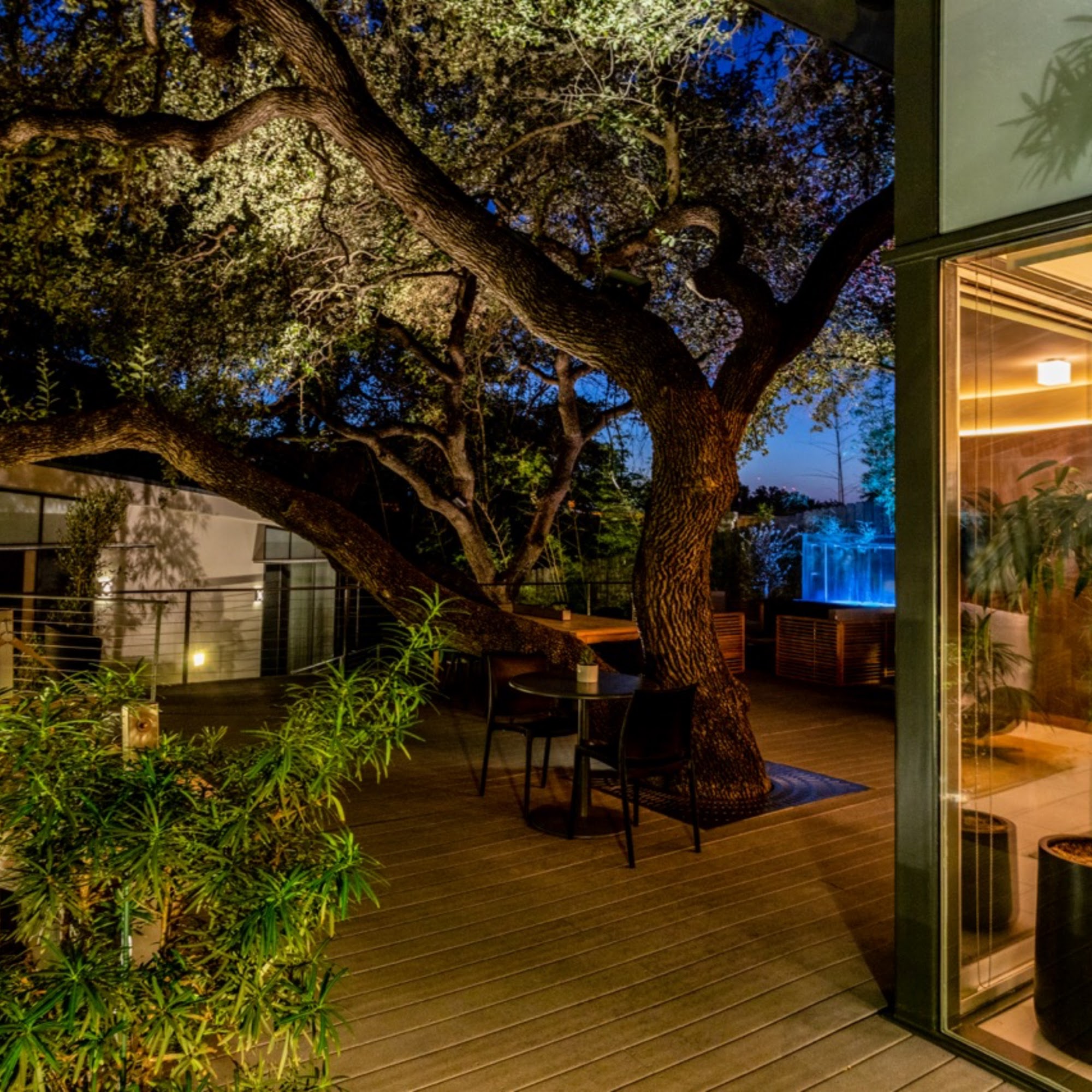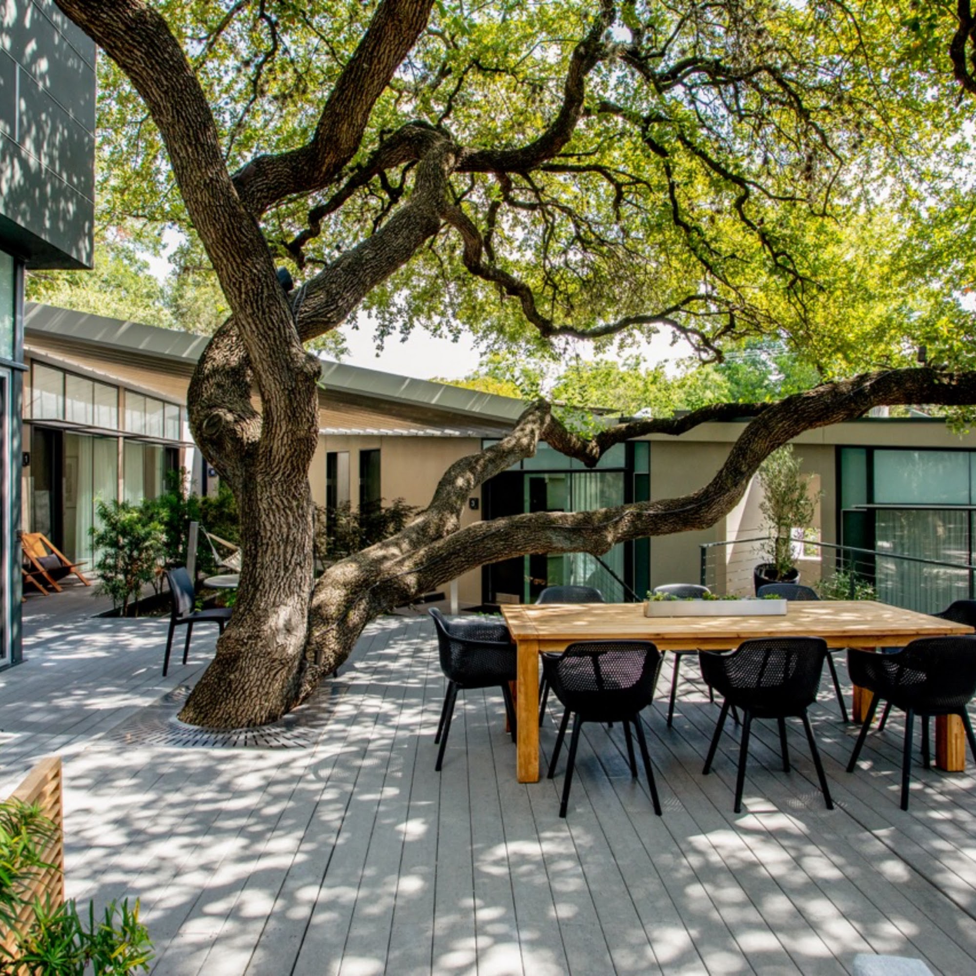 Frame Hotel - Treehouse, formerly known as Kimber Modern, offers a unique and serene experience just steps away from Austin's vibrant South Congress Avenue. This modern hotel features seven beautifully designed rooms that provide a luxurious feel with their spacious layouts, high-quality linens, and cloud-like mattresses. Guests have access to a charming common area, which includes a lovely living room, a well-stocked fridge with beverages, and a top-notch espresso machine. The property is designed around a stunning Live Oak tree, creating a tranquil courtyard that features a waterfall, hammock, and comfortable seating. The hotel is known for its cleanliness and attention to detail, making it feel like a serene oasis. Guests appreciate the privacy of the hotel, accessed via a personal digital code instead of a traditional lobby. The staff is praised for their helpfulness, providing early check-in, kitchen guidance, and local recommendations. Despite being near lively nightlife, the hotel ensures a peaceful atmosphere, with noise machines available in the rooms. Frame Hotel - Treehouse is perfect for both leisure and business travelers, making it a top choice for visitors to Austin seeking a peaceful retreat in a prime location.
