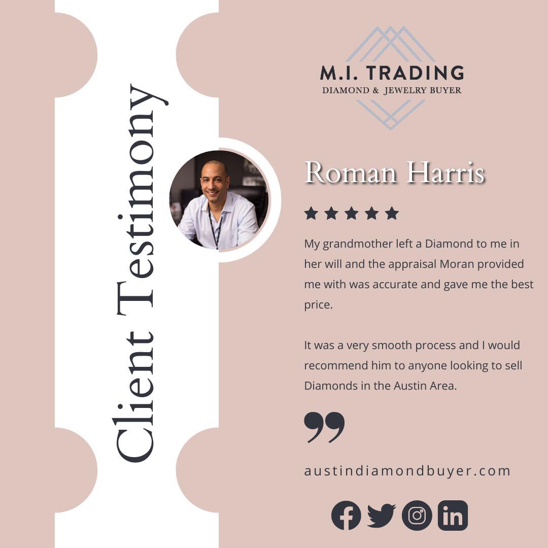 M.I. Trading Diamond and Jewelry Buyers is a trusted business located in Austin, Texas, that specializes in buying both certified and non-certified diamonds, as well as jewelry. Operating by appointment only, they serve a wide area including Round Rock, Georgetown, Marble Falls, Waco, Fredericksburg, Cedar Park, Lakeway, Kyle, Buda, San Marcus, San Antonio, and beyond. The company is known for offering consistently higher prices for those wanting to sell their jewelry, ensuring sellers receive a fair market value. Customers appreciate the knowledgeable, honest, and transparent service provided by the staff, especially Moran, who is described as friendly, caring, and passionate about his work. Many reviews highlight the quick and smooth process, with appointments often available on the same day. The business has a boutique feel without the fussiness of upscale stores, making the experience personal and reassuring. Sellers value the clear explanations and fair prices, whether they are selling small gold earrings or heirloom pieces. Overall, M.I. Trading is highly recommended for its integrity, expertise, and excellent customer care, making it a trusted choice for jewelry and diamond selling needs.