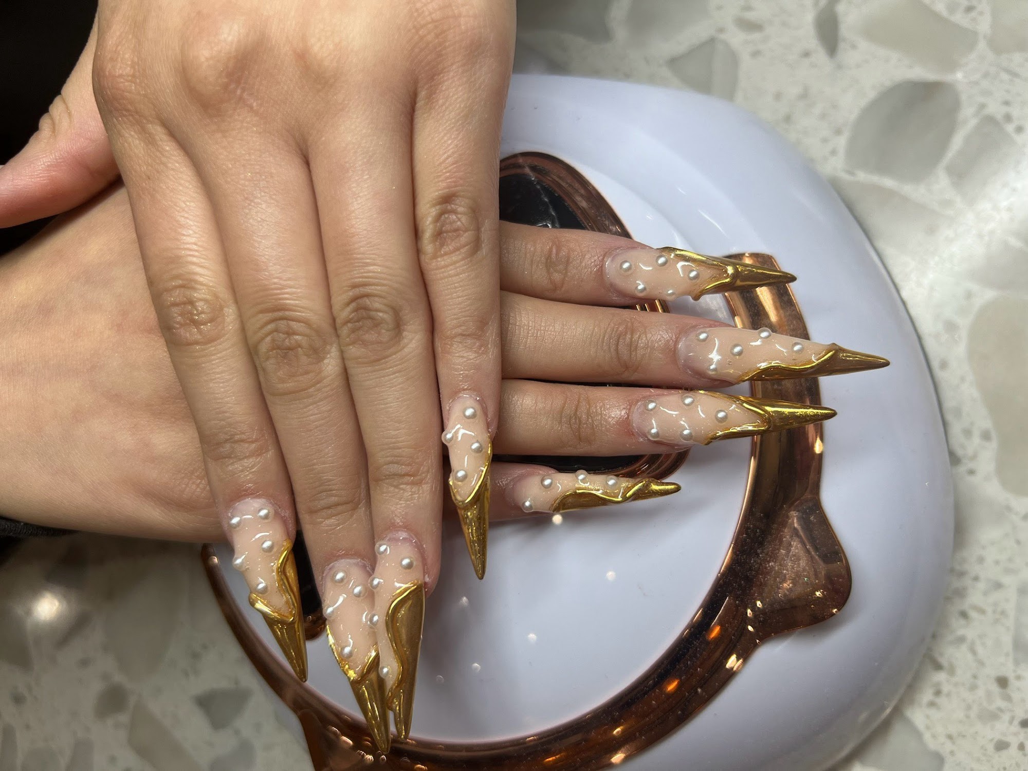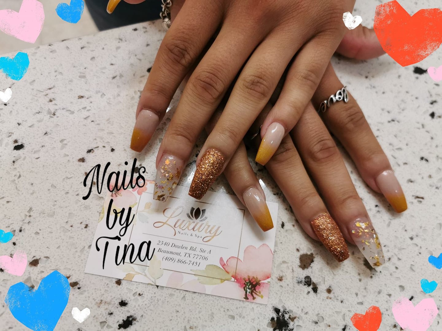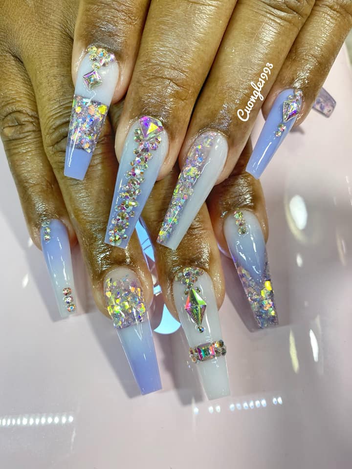 This nail salon is so nice loving the LED lights with diamonds on the table. I got a peach/ coral color I got medium coffin nail But didn’t know the color glows in the dark! … but it looks nice and cute!