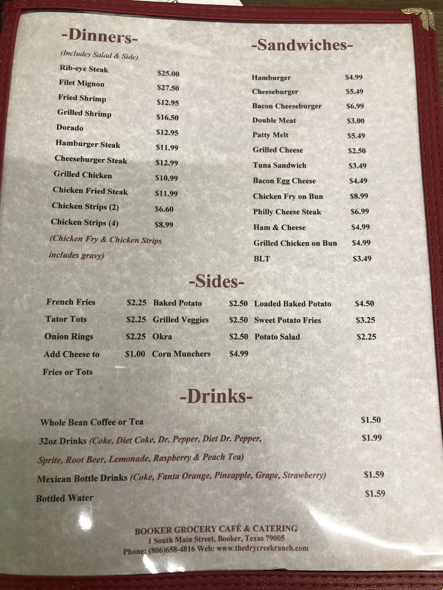 Booker Grocery Cafe & Catering offers a warm, small-town atmosphere with home-cooked food and friendly service. The restaurant features a grocery store right through the dining area, making it convenient for customers. Known for its delicious cheeseburgers, it is praised for its quality and flavor. The menu includes a variety of options like sandwiches, wraps, chicken enchiladas, ribeye, and shrimp. Though prices can be a bit high, many find the food and service well worth it. Curtis, the butcher, provides excellent dry-aged prime fillets.