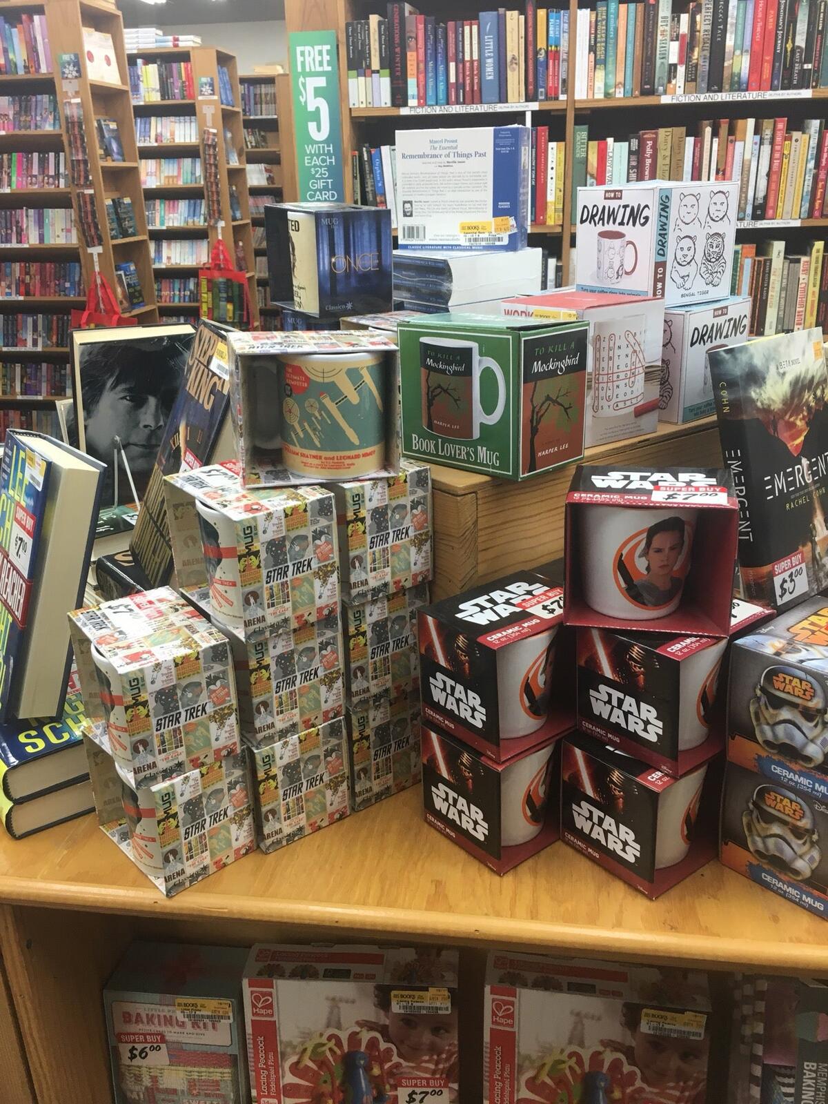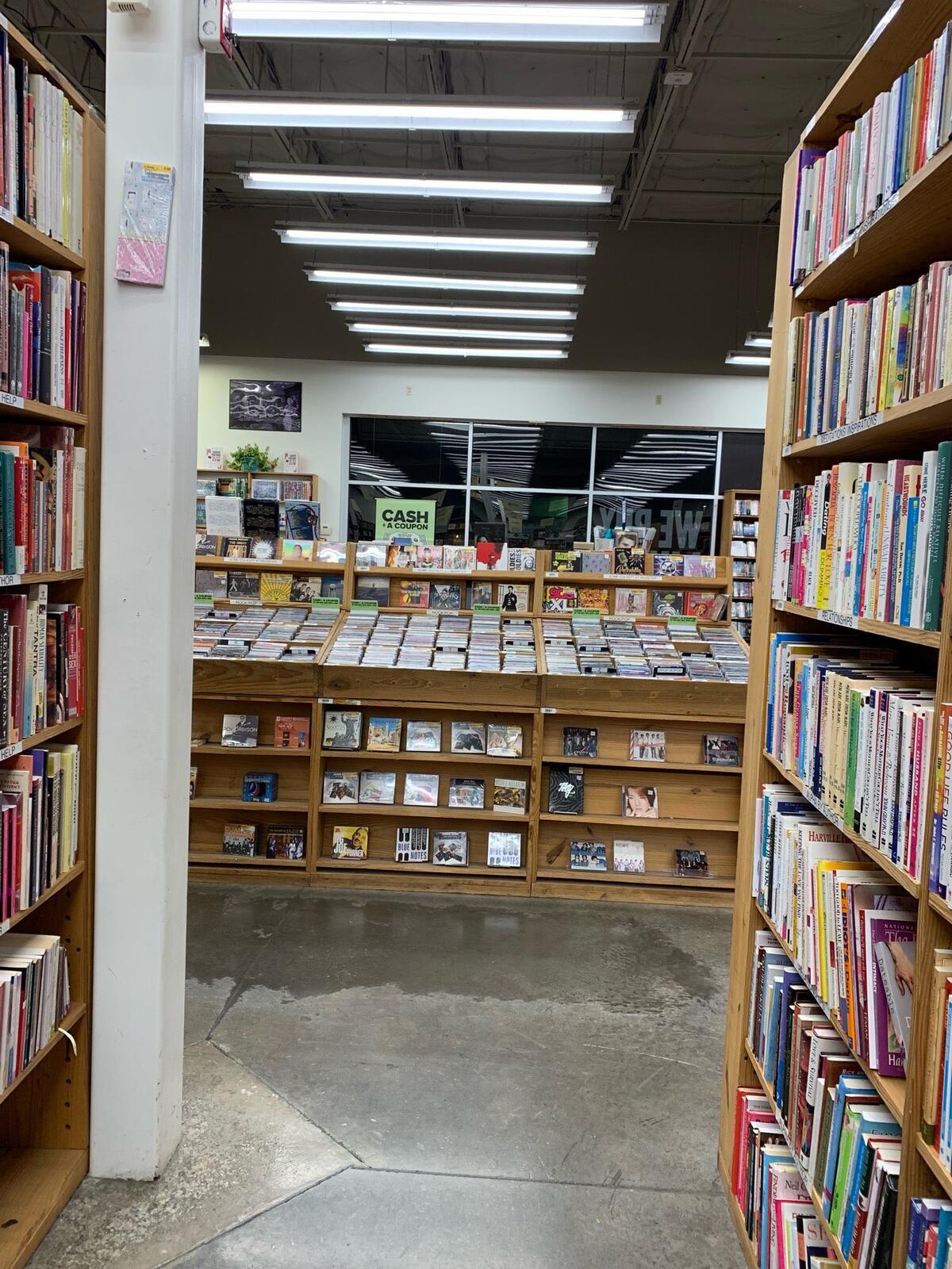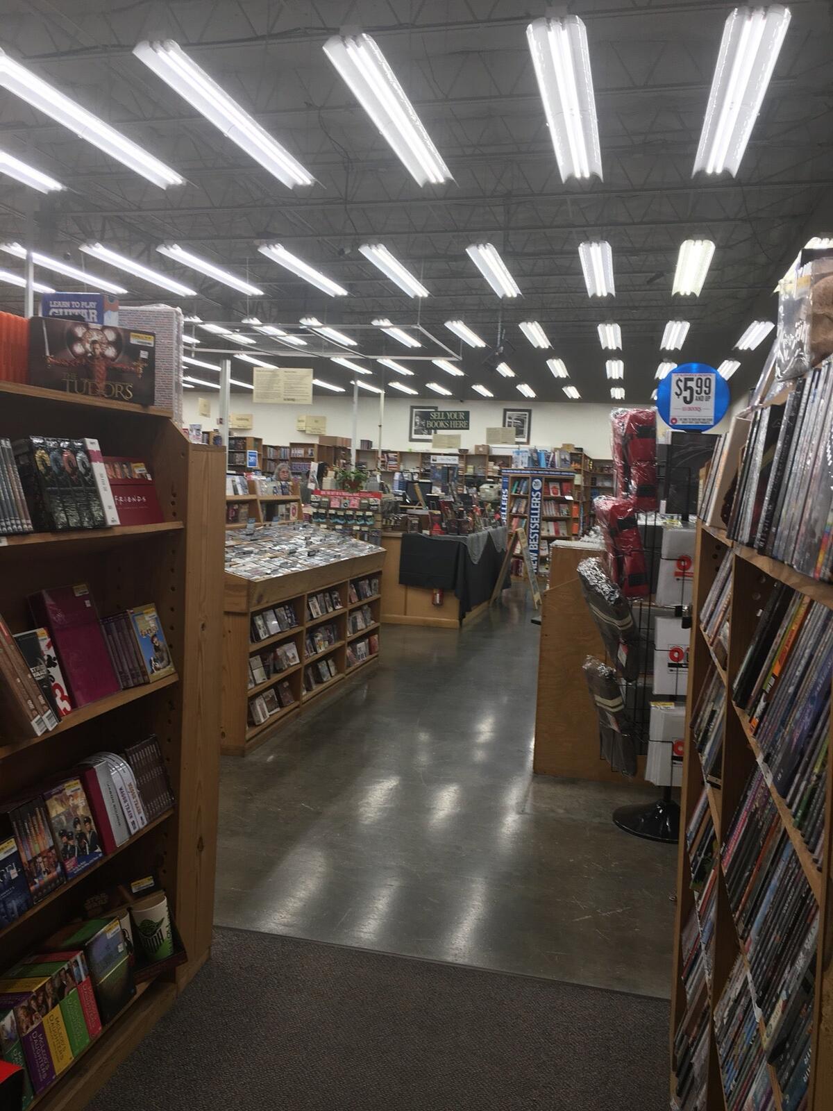 Half Price Books is a good place with a steady flow of customers and a good selection of books and DVDs. The store is currently buying from the public with limited hours and quantity restrictions. The shelves are organized by size, and the employees are bright and caring, offering great service. They can look up items and order them for a small shipping fee. Multiple times they have had DVDs brought over from other branches. It is a store run by interesting people who care about the books and read them. Customers love going there and will return.