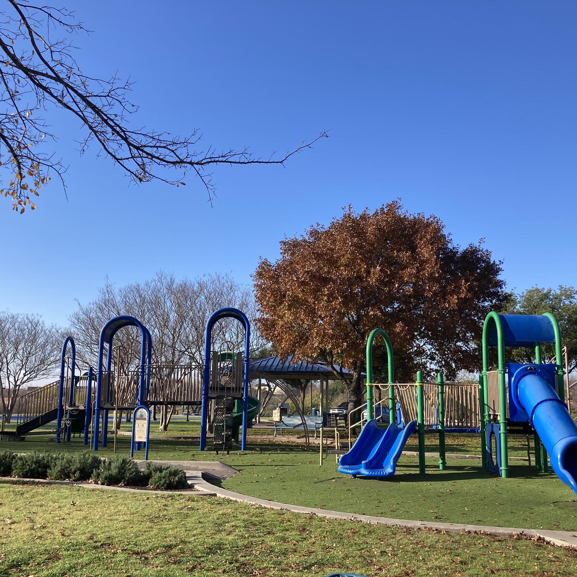 They’ve upgraded the ground cover from wood chips (bleh) to artificial grass (yay!)! What a huge difference this makes for us. Great little neighborhood park.