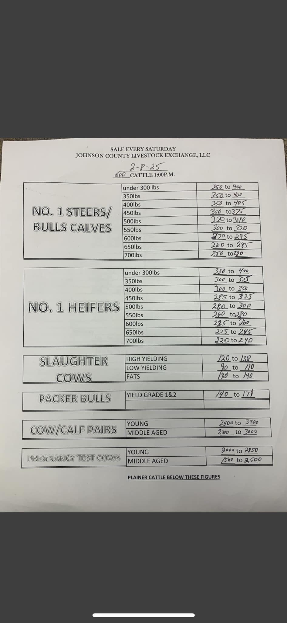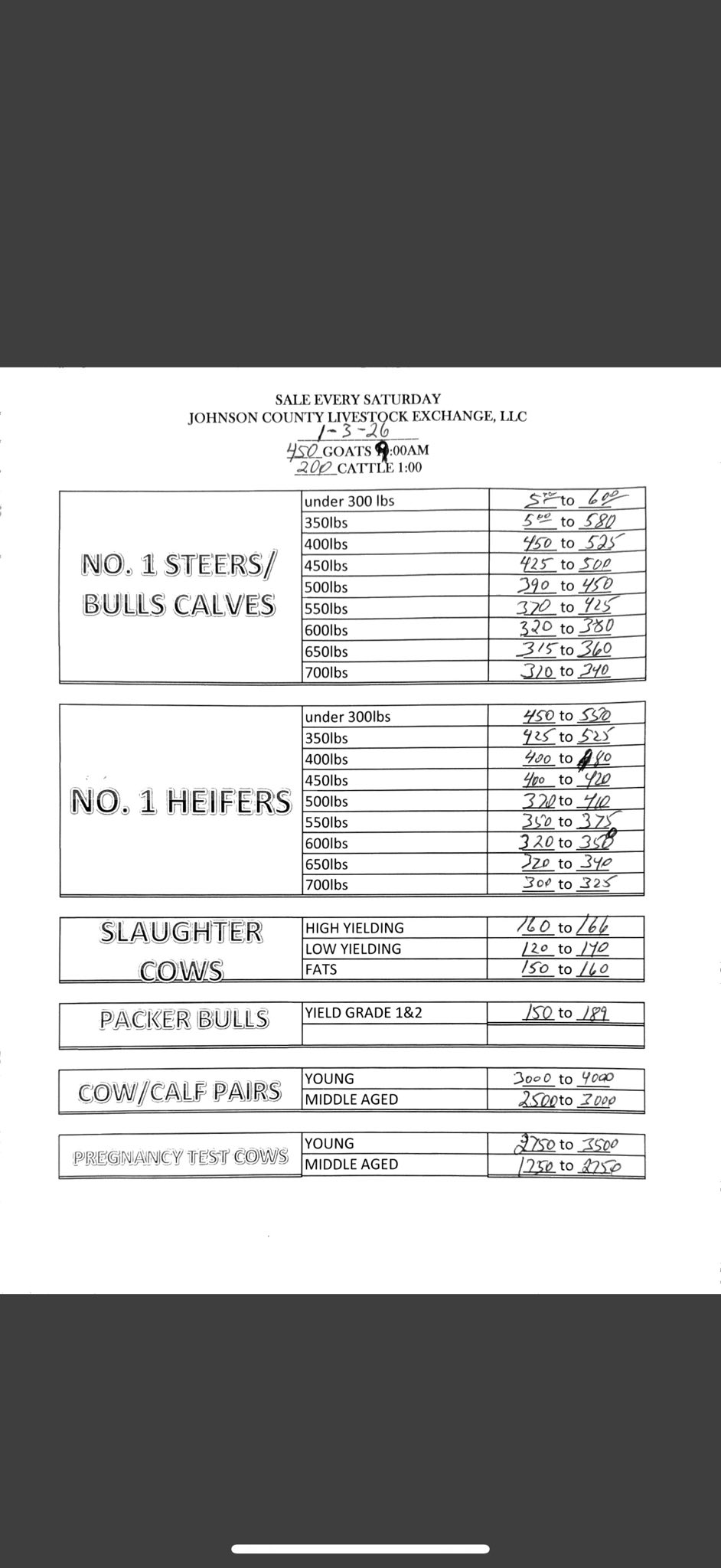 It’s been years since I’ve been to this sale barn but I look at the market chart that they post to see what and how much that the livestock are going for but their chart is about 2 months old don’t really help me out I don’t know about anyone else but it helps me know when to buy or sale