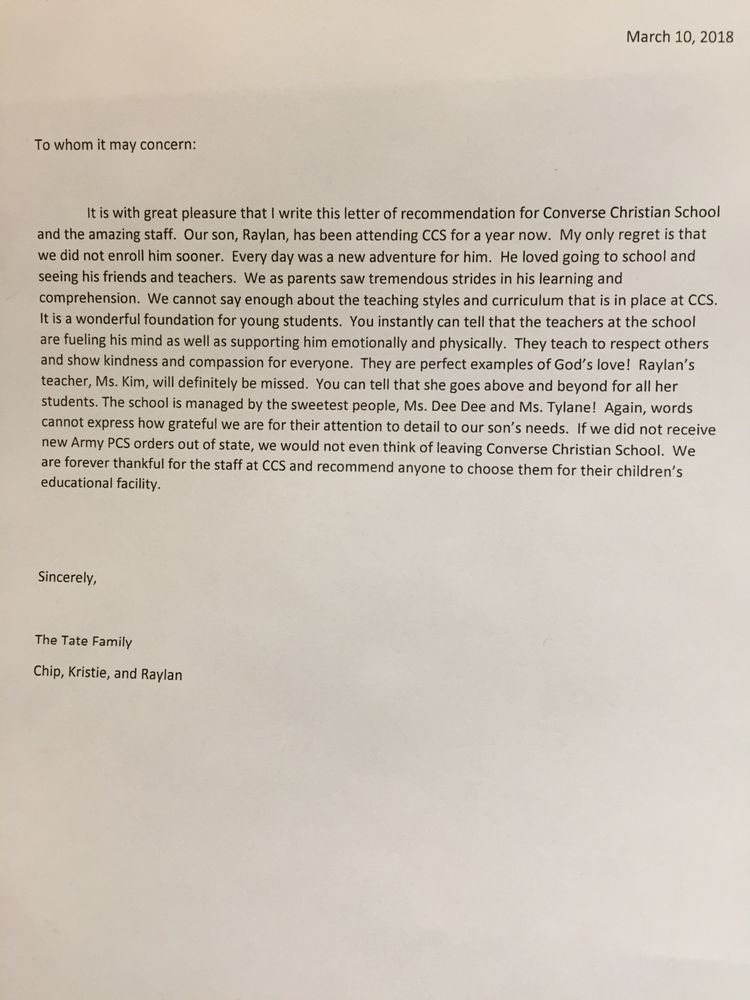 Both of my children have attended converse Christian School and I am glad to say that my family absolutely loves this education program and childcare. I have a two year old and now 5 year old who is absolutely thriving academically.Converse Christian School is the best