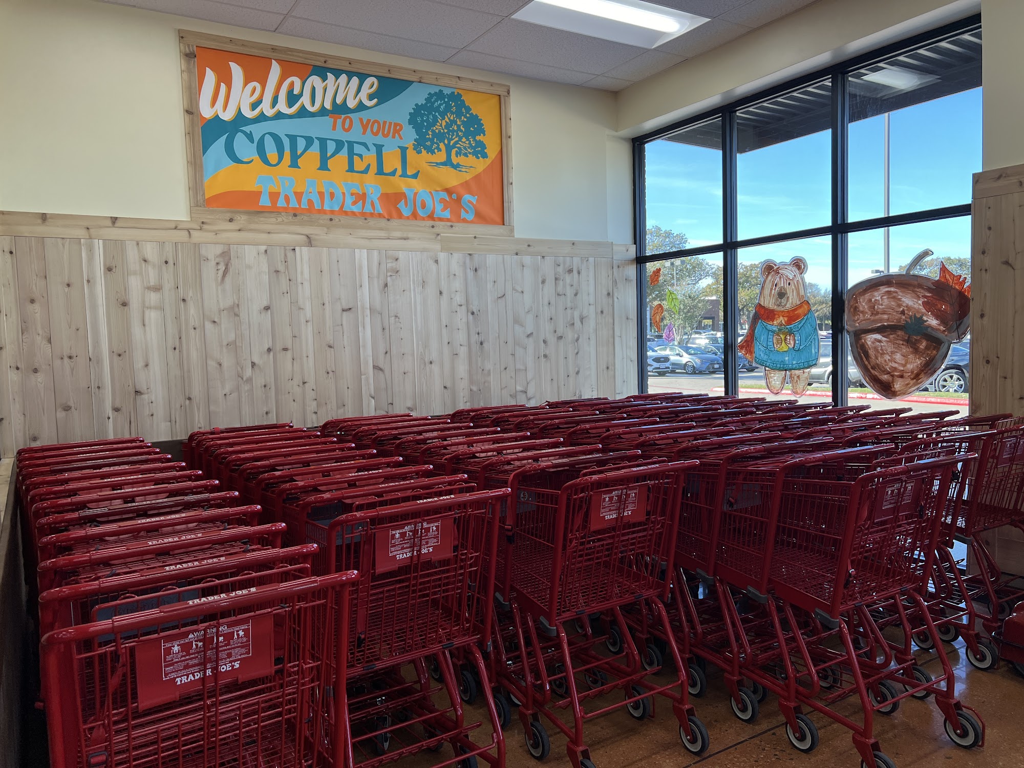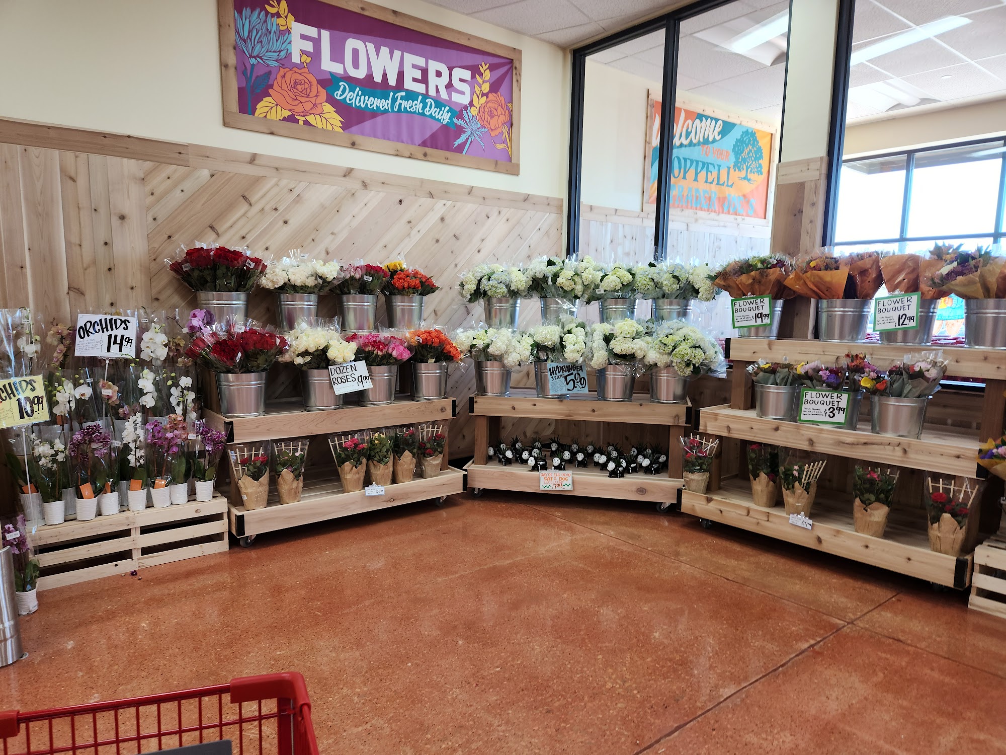 Trader Joe's in Coppell is a neighborhood grocery store offering an unconventional and interesting selection of products. It provides everyday basics like milk, eggs, meat, bakery items, and fresh produce, alongside unique Trader Joe's label items such as Mandarin Orange Chicken, Cold Brew Coffee Concentrate, and frozen foods like Steak & Stout Pies and the 5 Cheese Greek Spiral. The store is a good source for great cheese and offers a vibrant selection of fresh flowers and plants, including foliage like the Pilea Peperomioides. The store features a familiar, easy-to-navigate layout with wide aisles and is located in a business center with an ample parking lot. It is surrounded by various shops, allowing customers to get many errands done in one spot. The environment is nice and clean. Customers praise the great prices, friendly, awesome, and helpful staff who provide a nice, welcoming, and exceptional shopping experience, always assisting with a smile. The store offers a lot of unique stuff not found at other grocery stores, including a wide selection of frozen Asian food, healthy snacks, prep food in the deli, baked goods, and wines with helpful flavor notations and pairings. Many mention leaving with a full cart. The store also has trendy signature tote bags, great for gift giving.