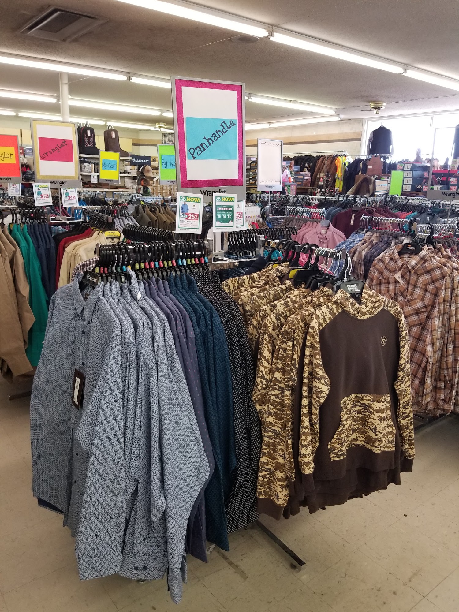 Good hometown store, good selection of supplies and good clothing with good prices.