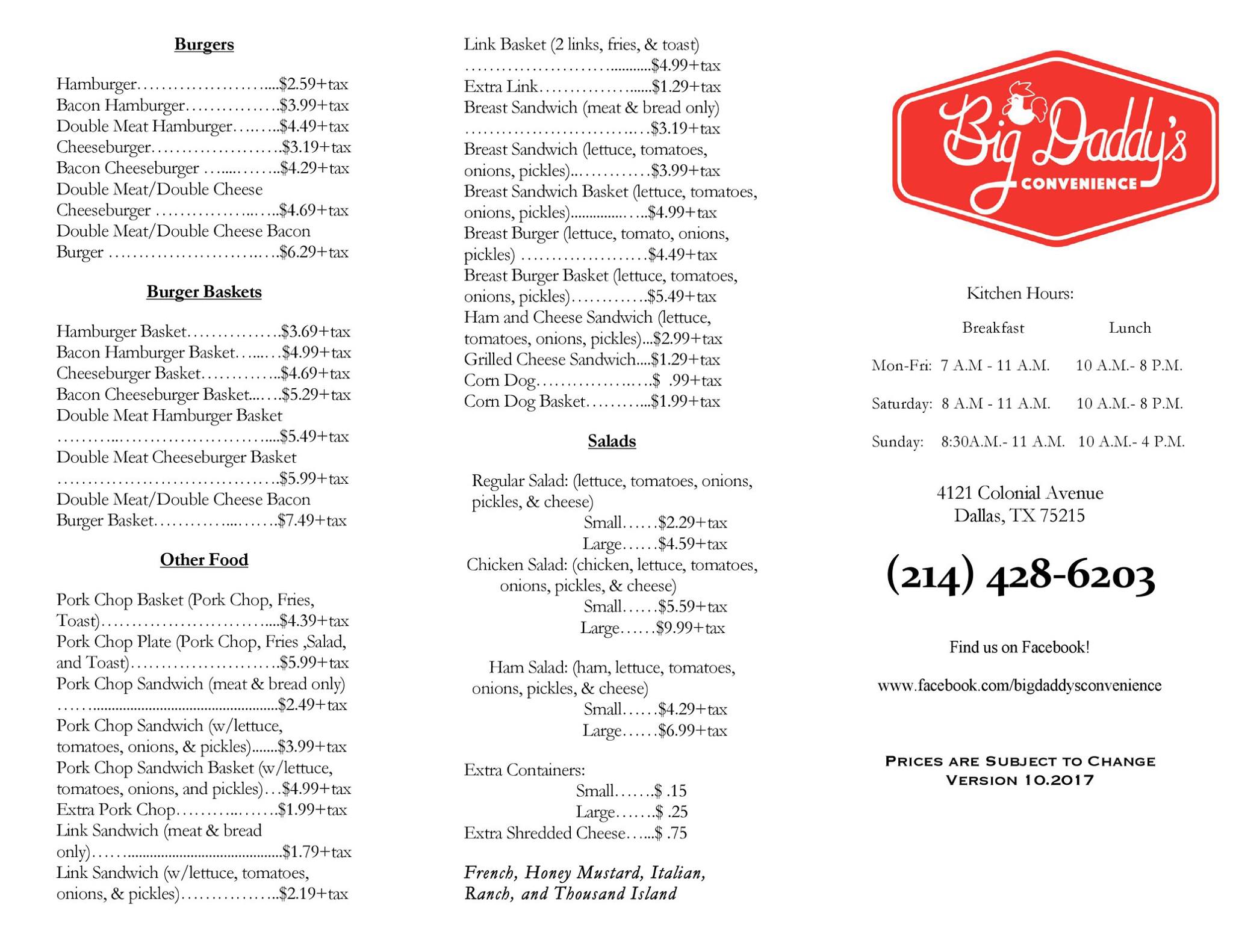 Big Daddy Convenience Store is a great little hole-in-the-wall mom-and-pop store in South Dallas. The food, particularly the fried chicken and the chicken salad, is delicious, out of this world, and top tier. The chicken salad is so large and filling that it can make you very full. The fish basket and burgers are also noted, with great seasoning on the fish. However, expect very long wait times for food, especially for the salads between 11am and 2pm, often 30 minutes or more. The system can seem unstructured, and calling in orders for chicken salad is not effective. While the salads are what made them popular, they are described as more of a meat salad with very little lettuce. Fries are considered mediocre. The staff can sometimes be perceived as rude. It is a place where you should plan to wait and be prepared for it. Despite the waits, many recommend it and find the food worth it.