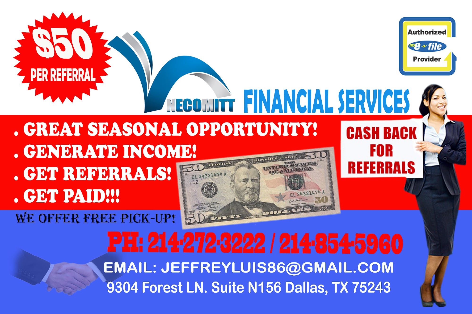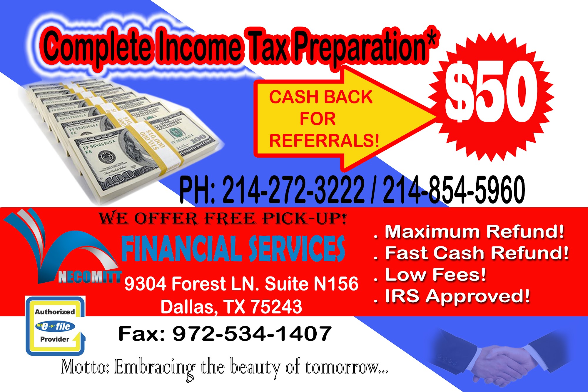 Necomitt Financial Services, based in Dallas, TX, is dedicated to helping clients achieve a secure financial future. With a strong focus on tax consulting, the business has earned high praise for its knowledgeable and efficient service. Customers appreciate the friendly atmosphere and the effort made to create an enjoyable experience, especially for families. Many clients have relied on the expertise of their specialists for years, even after relocating, due to their commitment to maximizing tax returns. Overall, Necomitt Financial Services is highly recommended for anyone seeking reliable tax assistance and financial advice.