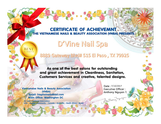D'Vine Nail Spa II is Nail Salon located in El Paso, TX. We offer a multitude of services including: Pedicure, Manicure, Fancy Nails, Luxury Nails, Eyelash Extension, Microblading Services, Skin Care, Facials & many more Nail Services! Here at D'Vine Nail Spa, our goal as a Nail Bar is to provide exceptional services in a relaxing atmosphere for our clients. All of our technicians are professional and experienced so you can be sure each visit you will leave with perfect nails. Take time out of your busy day to stop by our salon to come get pampered! Walk-ins Welcome! Contact us today to schedule an appointment!