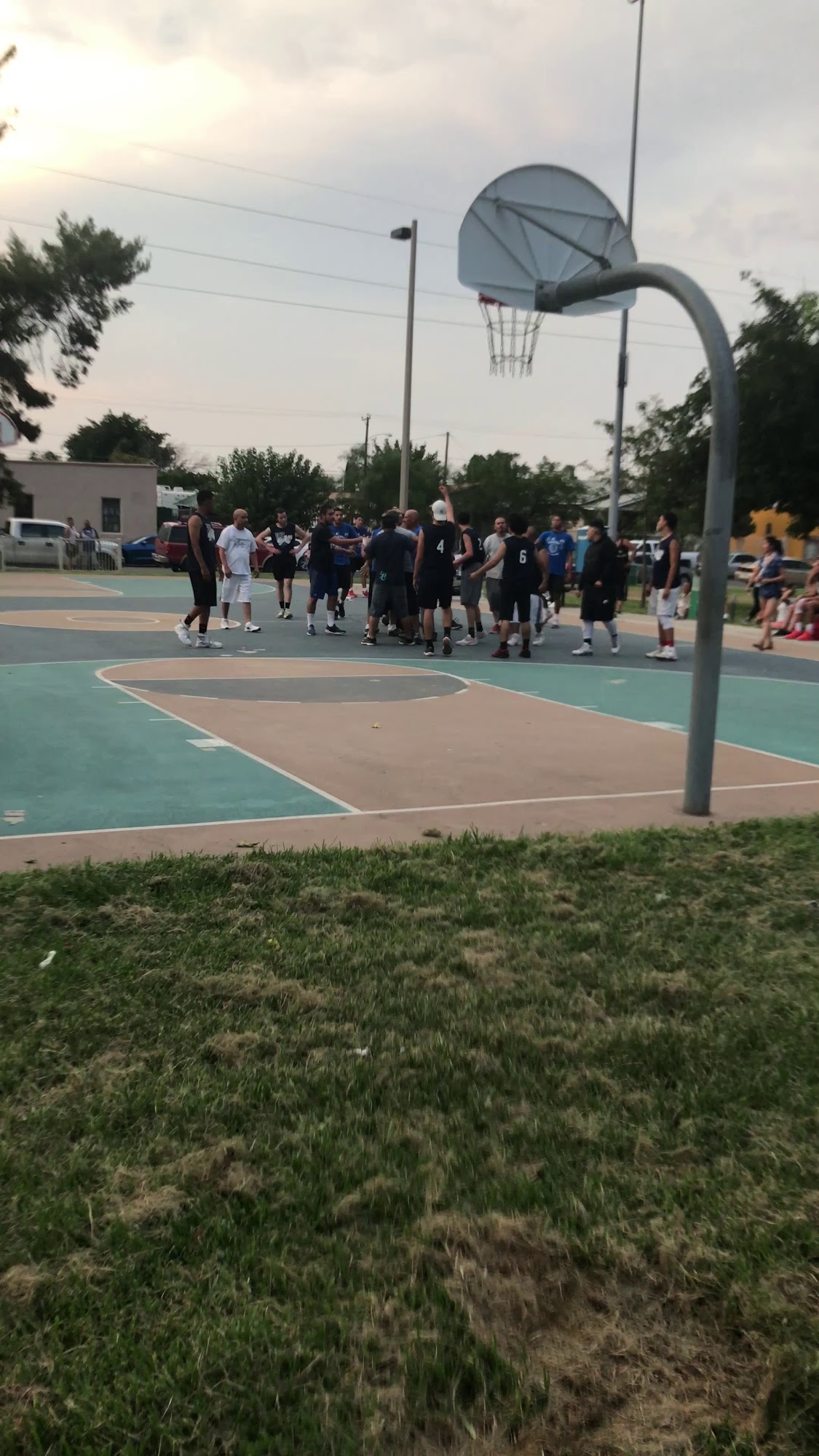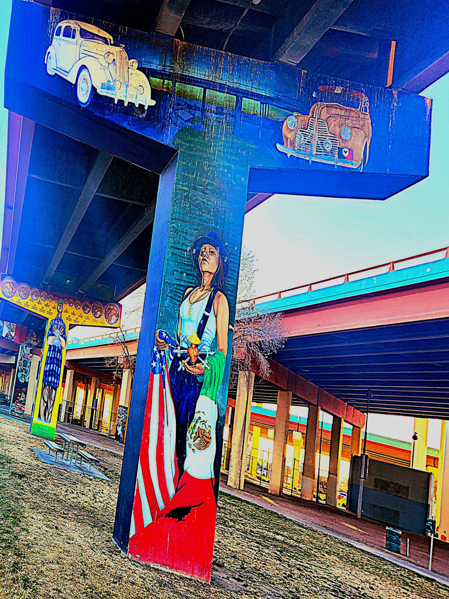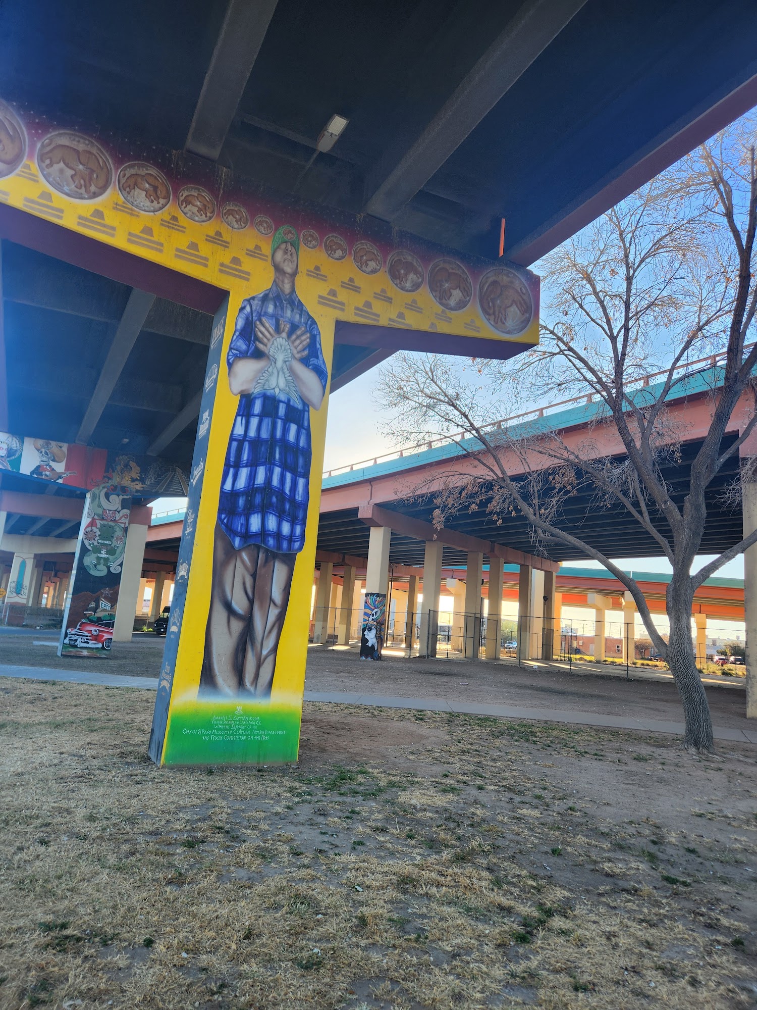 Estrella Rivera Park features gorgeous cultural murals on the highway bridge pillars, depicting the city's history with articulate skill. The park offers a playground, a repainted basketball court that is not slippery, and picnic areas on grass in the desert setting. Nearby, there is a really great taco or burger truck and another restaurant a block southwest, with walls filled with art. The improvements make it a place worth stopping by.