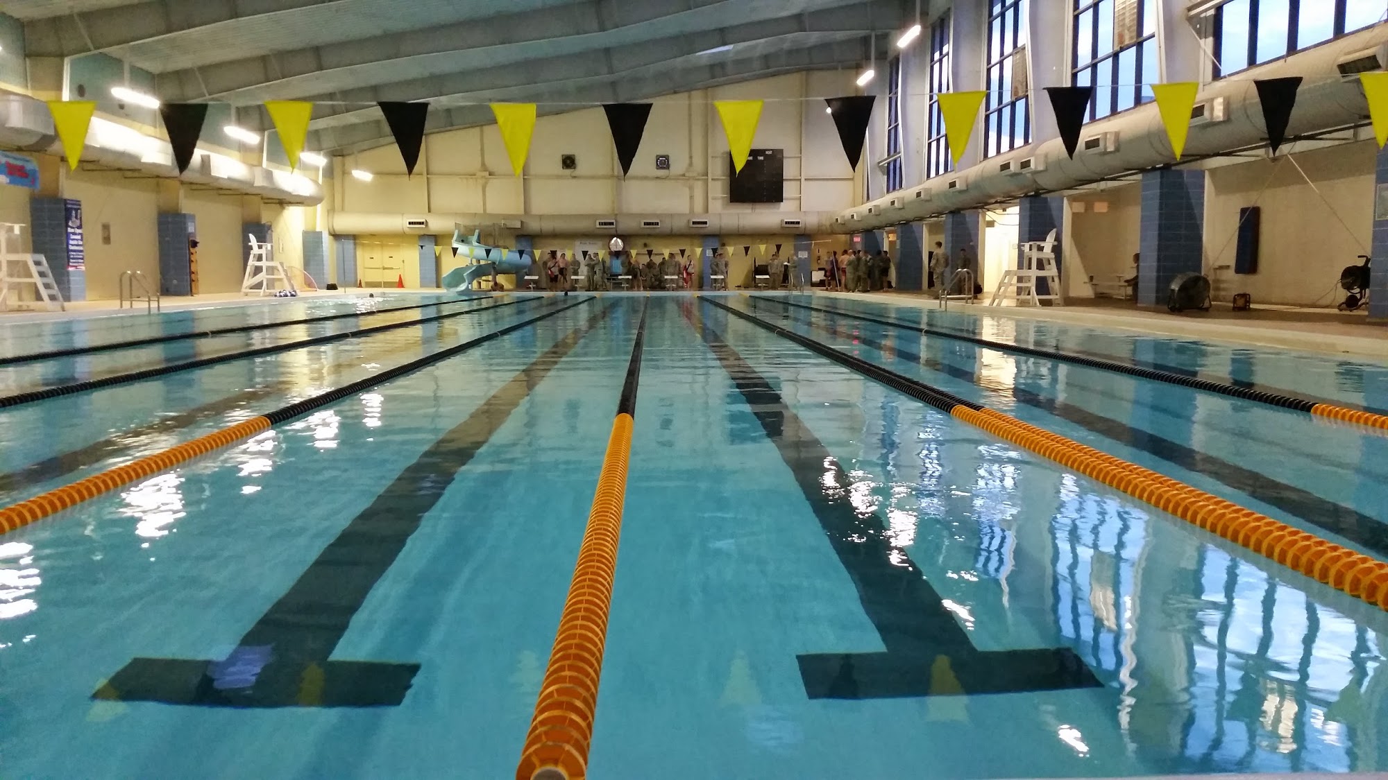 Replica Aquatic Center offers a pleasant swimming experience with a well-maintained Olympic-sized pool. The facility is clean and staffed with lifeguards, ensuring safety for all visitors. While there is no towel service, the spacious lanes and comfortable water temperature enhance the experience. The pool is heated and features a water slide, making it enjoyable for everyone. Service members can swim for free, and the hours accommodate after-work practices, making it a great option for fitness and relaxation.