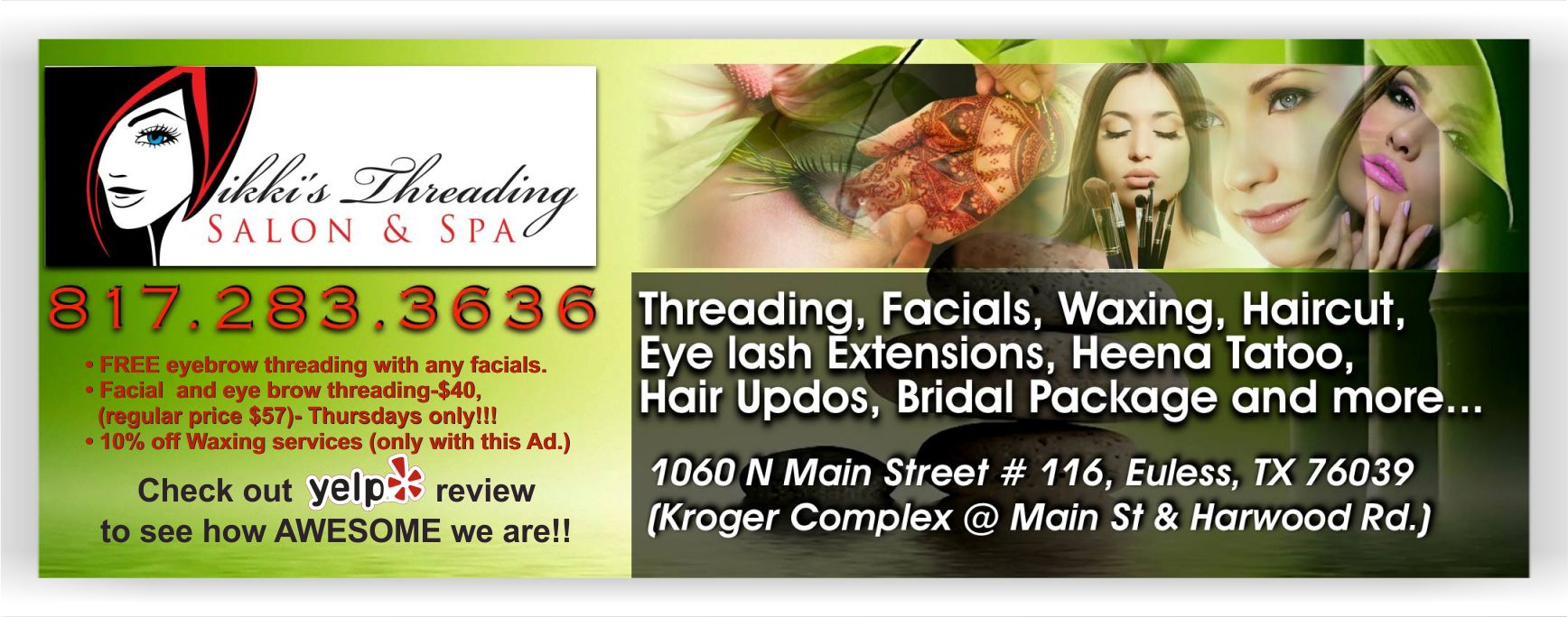 We are family run Salon committed to your 100% satisfaction. We want to build a long family like relationship (or friend like!) with our patrons and strive to make you happy, when you walk out of our salon. We offer- Eyebrow threading, Eyebrow waxing, Hair cut/style (ladies only), Hair color ( you have to bring your own color), Hair Updos, Facials, Waxing, Eye lash extensions, Eyebrow tinting, Heena Tatoos, Make up services, microdermabrasion and more. Our prices are very competitive and we can proudly say that hardly few other salons offer quality work and exceptional services :), like us!!!. Thank you for checking us, we hope to see you soon and you will be glad that you did!!!