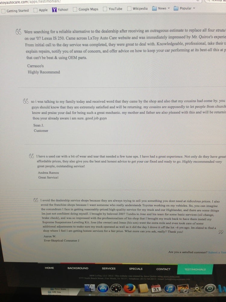 LxToy Auto Care specializes in bumper-to-bumper auto repair for Domestic, Asian, and Import vehicles, offering both mechanical and electrical repairs. Customers appreciate the fantastic and honest service provided by the team, often finding prices 30% lower than dealerships for the same services. Many reviews highlight their expertise, particularly with Toyota and Lexus vehicles, with clients feeling confident in their accurate diagnostics and fair pricing. One satisfied customer praised their prompt assistance during an emergency, despite the vehicle not being a typical service they offer. Overall, LxToy Auto Care is recognized for their personable service, skilled technicians, and commitment to vehicle maintenance, making them a top choice for auto repairs.