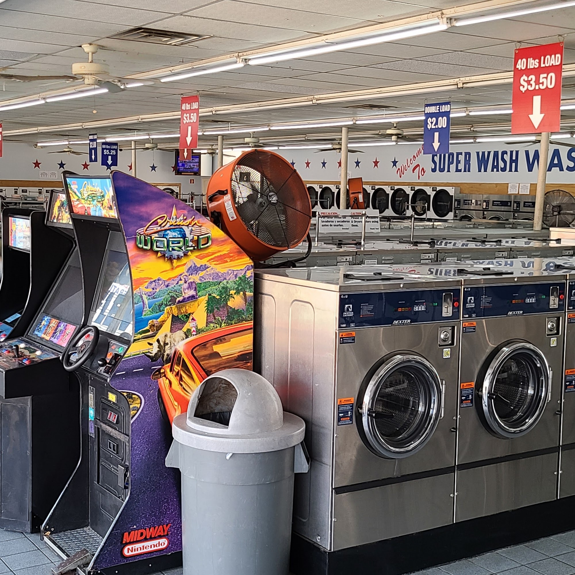 Super Wash Washateria is an excellent and clean place to wash clothes. The establishment is very clean, with clean floors and restrooms. It offers lots of big and small washers and many, many dryers that work fast and very well. Machines are working most of the time, and you never have to wait even when crowded. If there is ever a rare malfunction, the business is fast on repair and gives instant reimbursement. The staff are extremely hard working, kind, polite, professional, and friendly. The owner is absolutely incredible, very helpful, friendly, and a great leader. It is a family-owned business. The environment is comfortable and laid-back, making laundry day easier. Additional amenities include easy parking, video games, and soda and snack machines. Clothes come out looking great, fully, and cleanly for a great price. It is a clean, affordable place with excellent service, highly recommended for years to come.