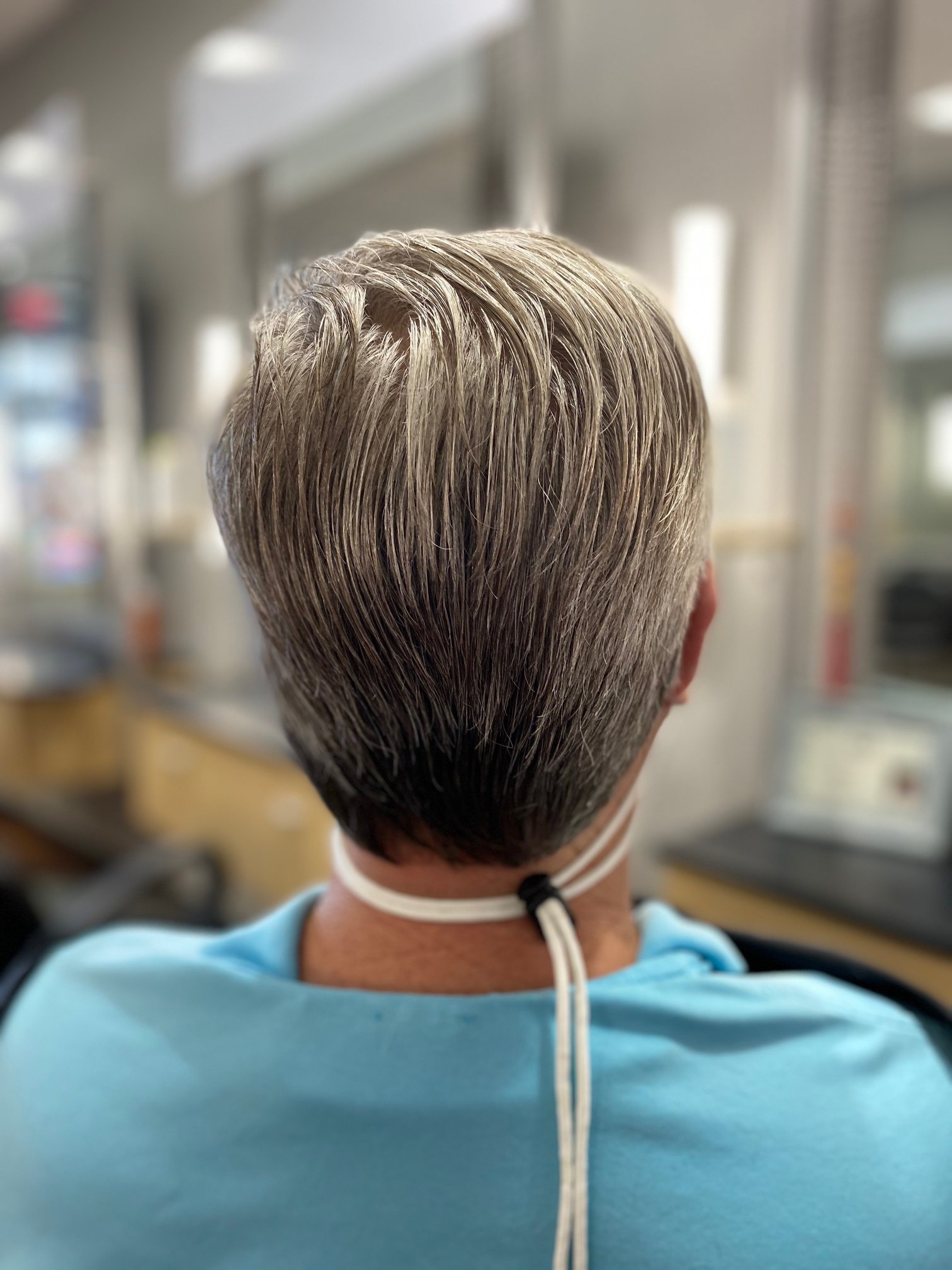 After wearing a natural style for a few years, I decided to step up the look. I got a shampoo/conditioner, cut, blow dry and flat iron. My gray hair is so soft and silky, and the cost was affordable. Thank you, Gloria!