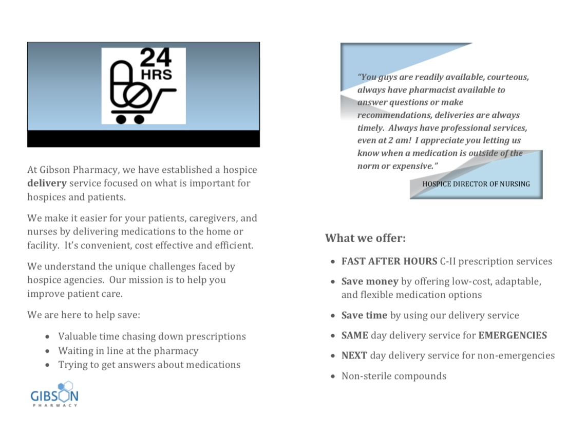 Excellent and responsive pharmacy! Affordable prices but my favorite thing about Gibson is their exceptional customer service! Can’t rave enough about their response time and professionalism. They make SupportingLocal an easy no-brainer decision! Thanks again Dr. Le!
