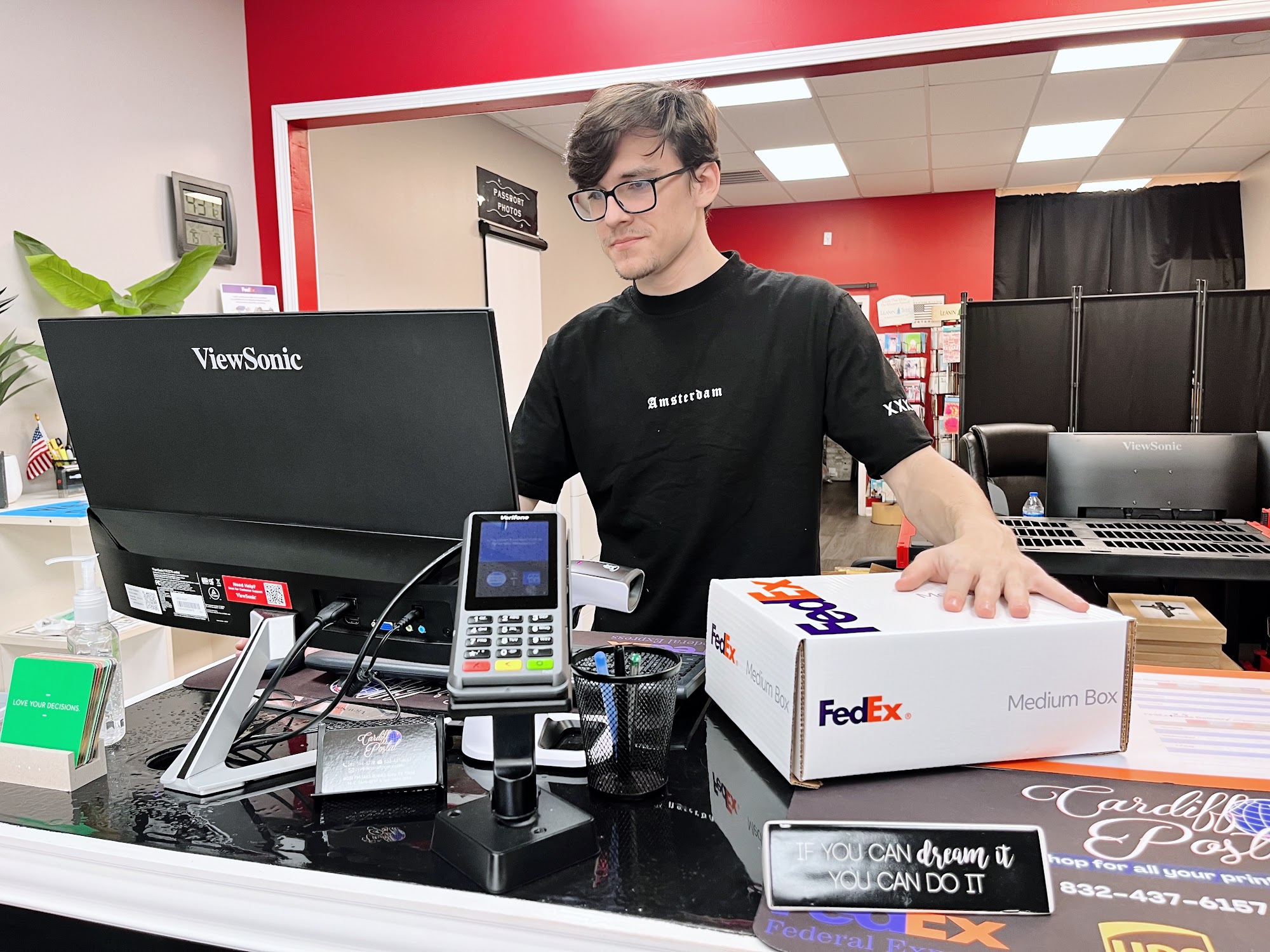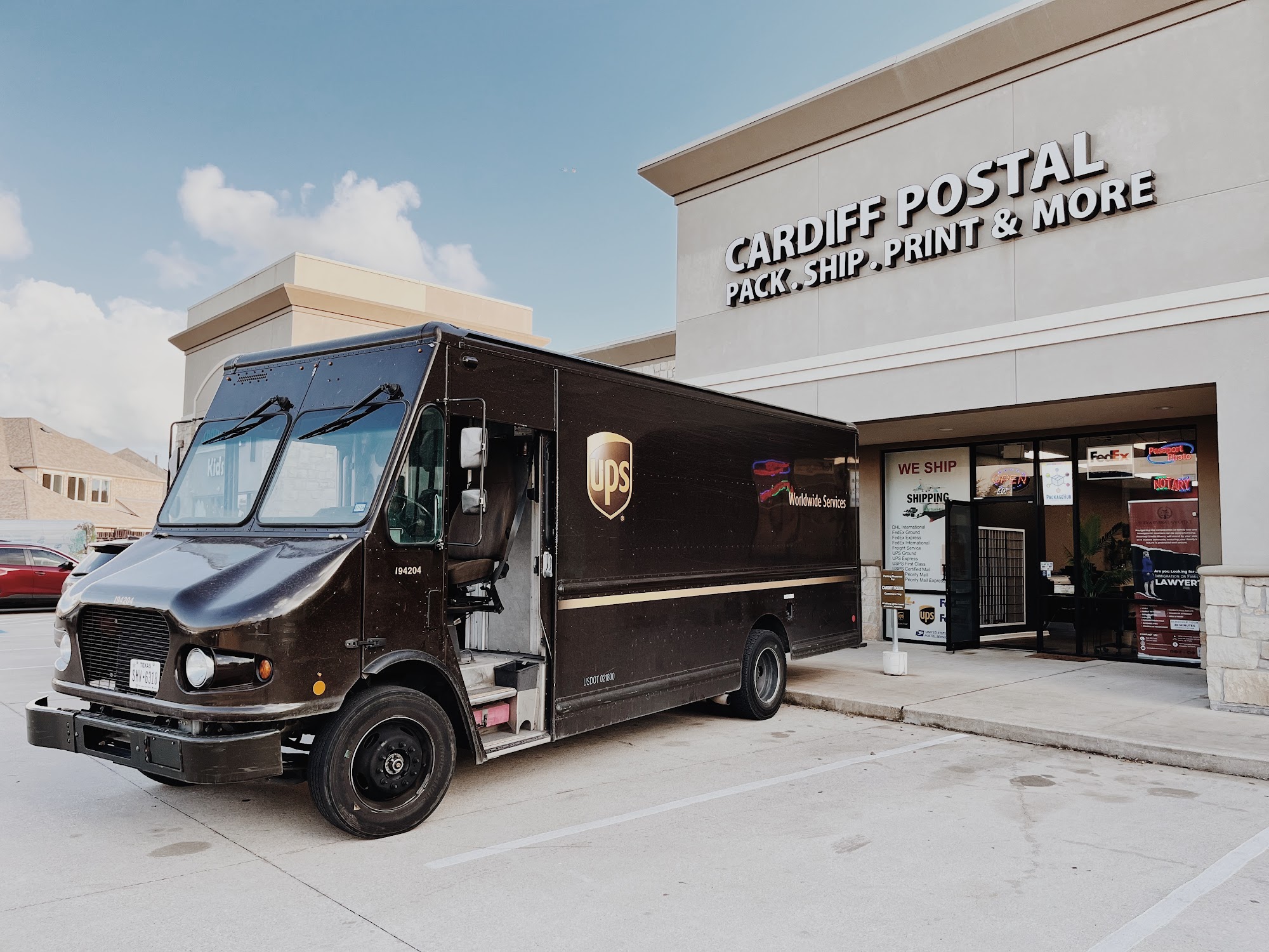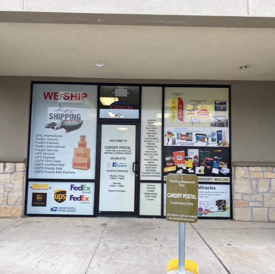 Cardiff Postal in Katy, TX - Post Office and More! Offering top-tier customer service for all mail, packaging, printing, and postal needs. Direct shipping with FedEx, UPS, USPS, and DHL for national and international delivery, including ground, air, express, urgent, priority, and overnight options. Beyond mailing, we're your local Print Shop, Notary Public, Graphic Designer, and Blueprint Service. Rent mailboxes, access digital printing, and get passport photos processed with ease. Trust Cardiff Postal for comprehensive mailing solutions.