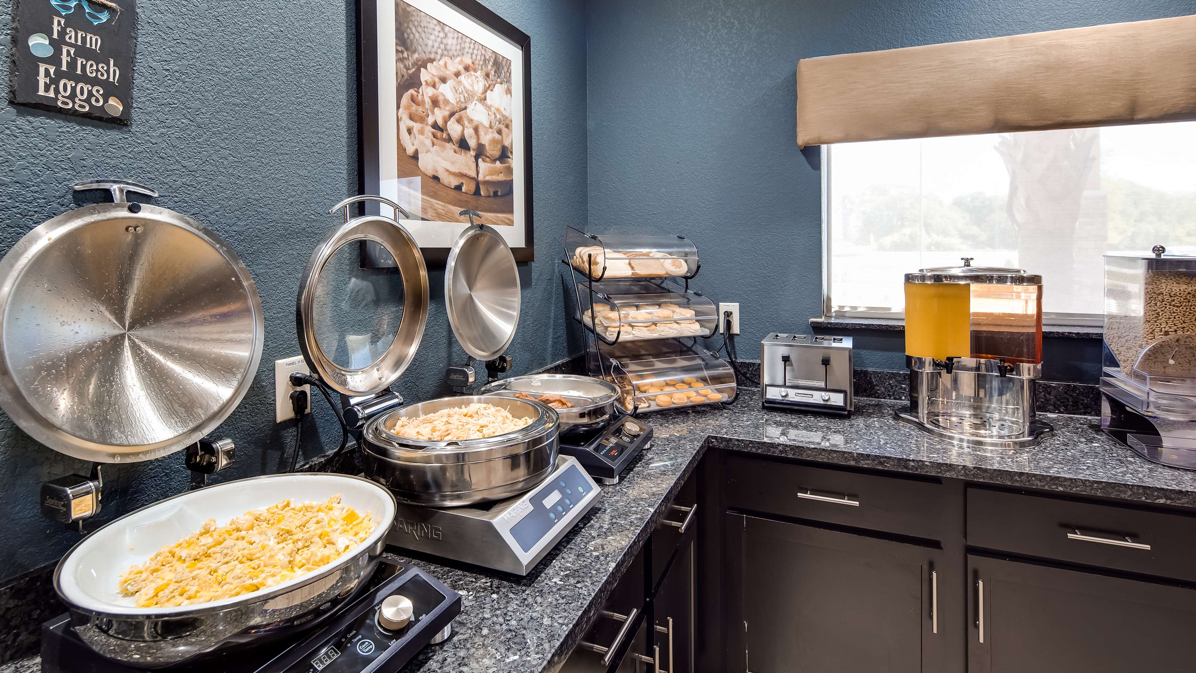 What a lovely property. Our first time here. Staff is super nice! Rooms are pretty and the beds are comfortable! The FREE Breakfast had lots of choices and everything we tried was good. Nice coffee selection with flavored creamers. They even offered refried beans and potatoes with your eggs and bacon. We will book again.