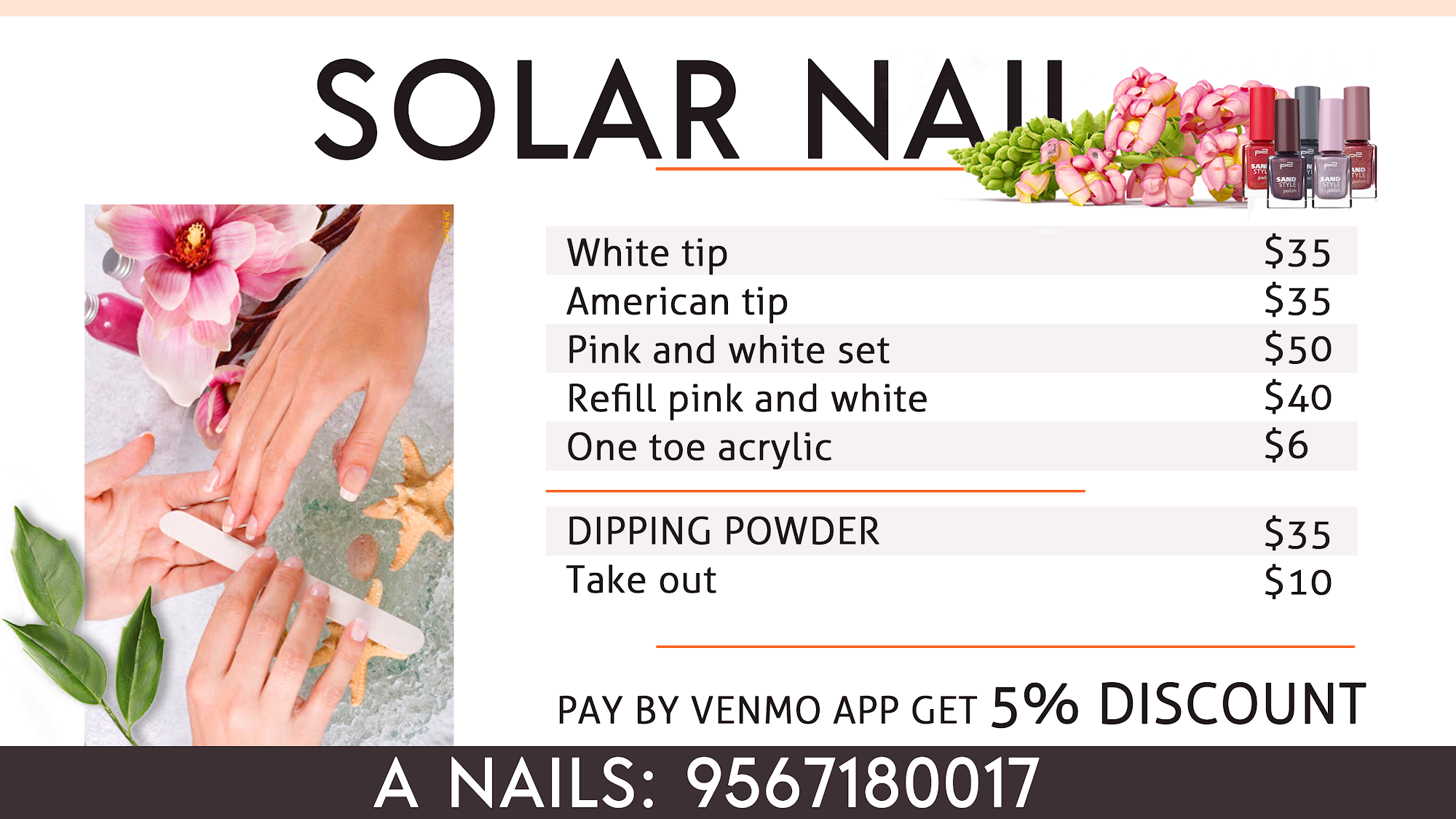 Clean, friendly and professional staff. Andy took care of my nails. I highly recommend A Nails!!