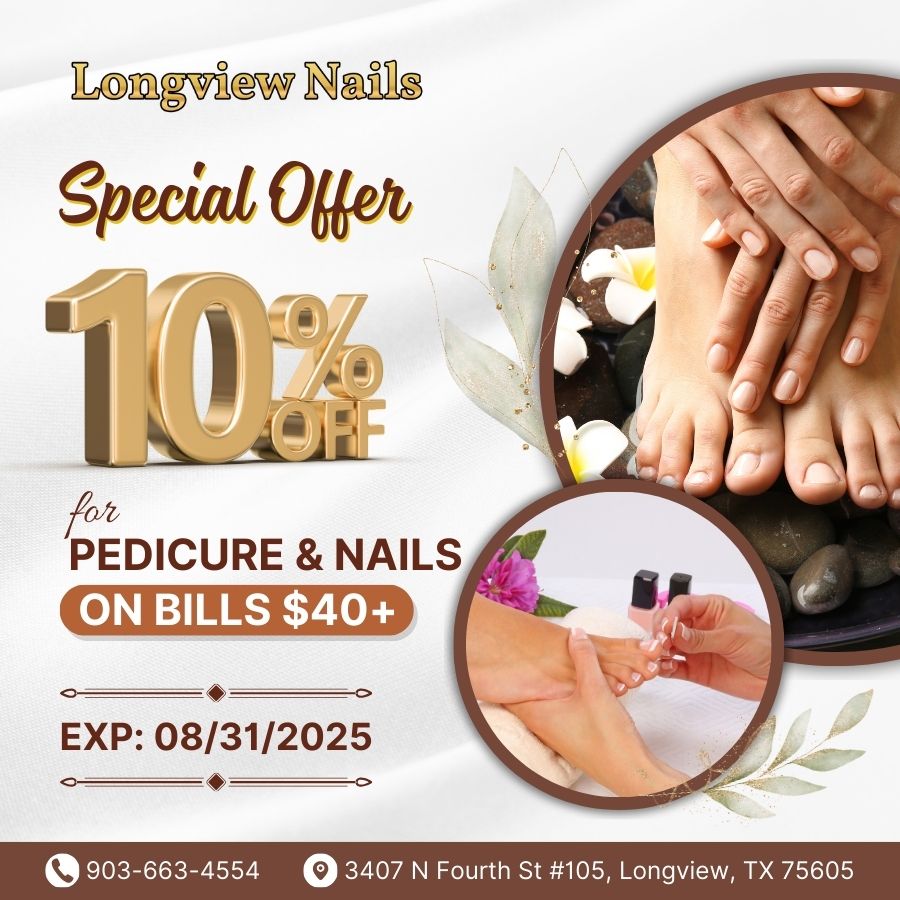 Located conveniently in Longview, TX 75605, Longview Nails is one of the best nail salons in the area. Our nail salon would bring you the most memorable and wonderful time when using our services! Our goal is to provide the highest level of customer service and satisfaction. We are staffed by qualified and knowledgeable professionals dedicated to perfecting the art of nail and skin care. With the highest quality standards of services and sanitation, we pride ourselves on offering you a relaxing and rejuvenating experience.